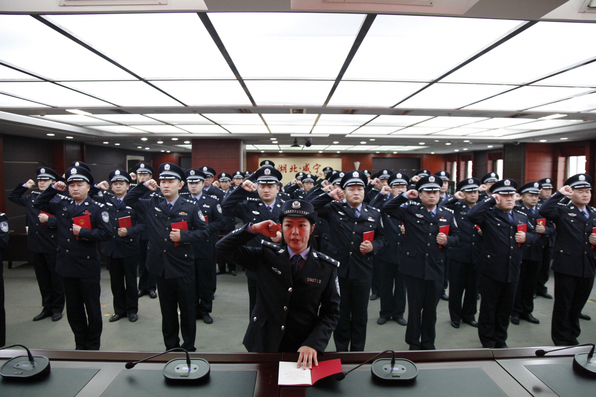 宣誓现场,民警面向国旗,手持《中华人民共和国宪法》,举起右拳,庄严宣誓:“我宣誓,忠于中华人民共和国宪法,维护宪法权威,履行法定职责,忠于祖国、忠于人民,恪尽职守、廉洁奉公,接受人民监督,为建设富强、民主、和谐的社会主义国家努力奋斗!