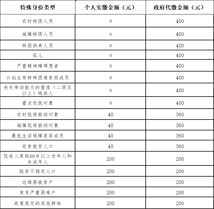 政府针对特殊人群参加城乡居民医保,进行分类资助,具体资助标准如下图所示: