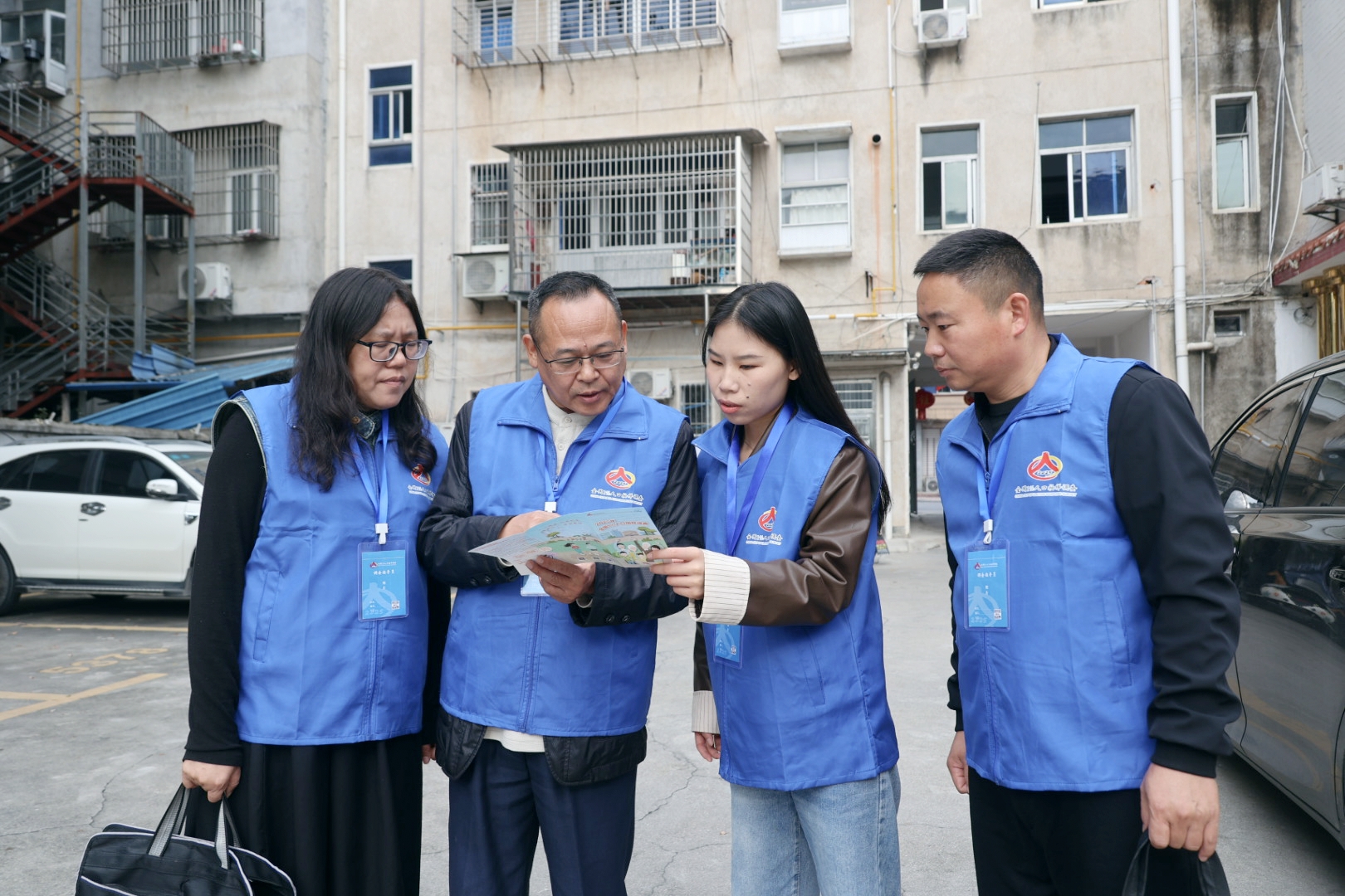 在古龙社区隽水1巷,调查员依据小区图,实地核验住房地址、楼层及居住状态,逐户核对信息,并向居民发放宣传资料,详细介绍调查内容与方法,确保核查深入细致。