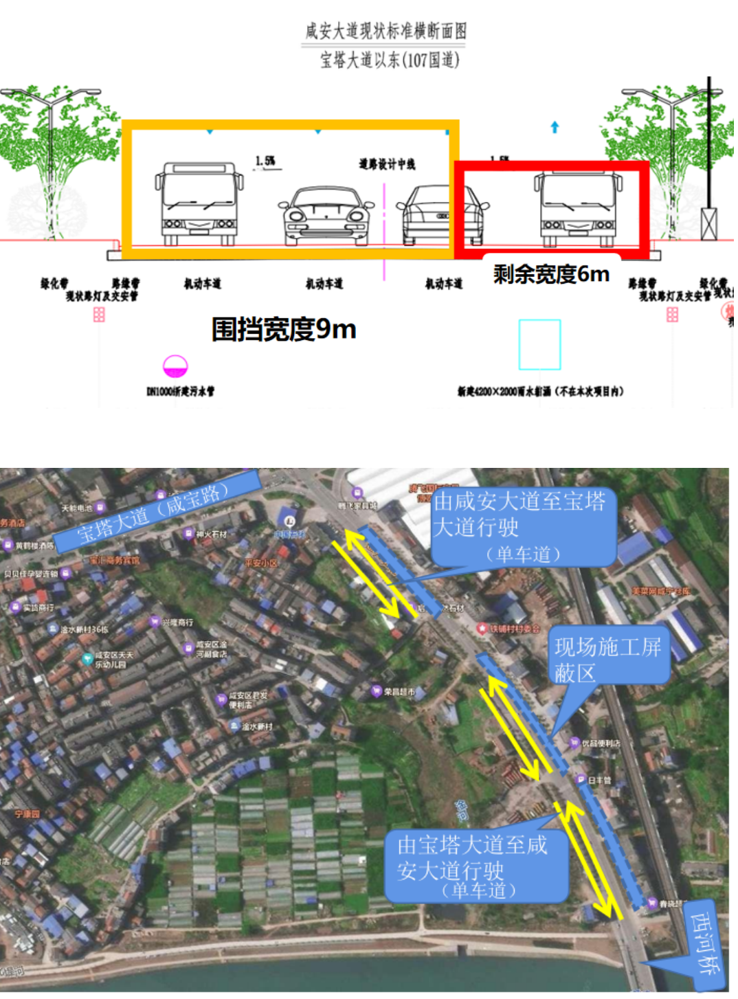 咸安大道(原107国道)段:现状机动车道为15米宽双向4车道,路中设置隔离护栏。施工围挡占9米宽车道,道路剩余宽度6米,东西方向各一个车道,施工区域前方设置警示标识标牌。