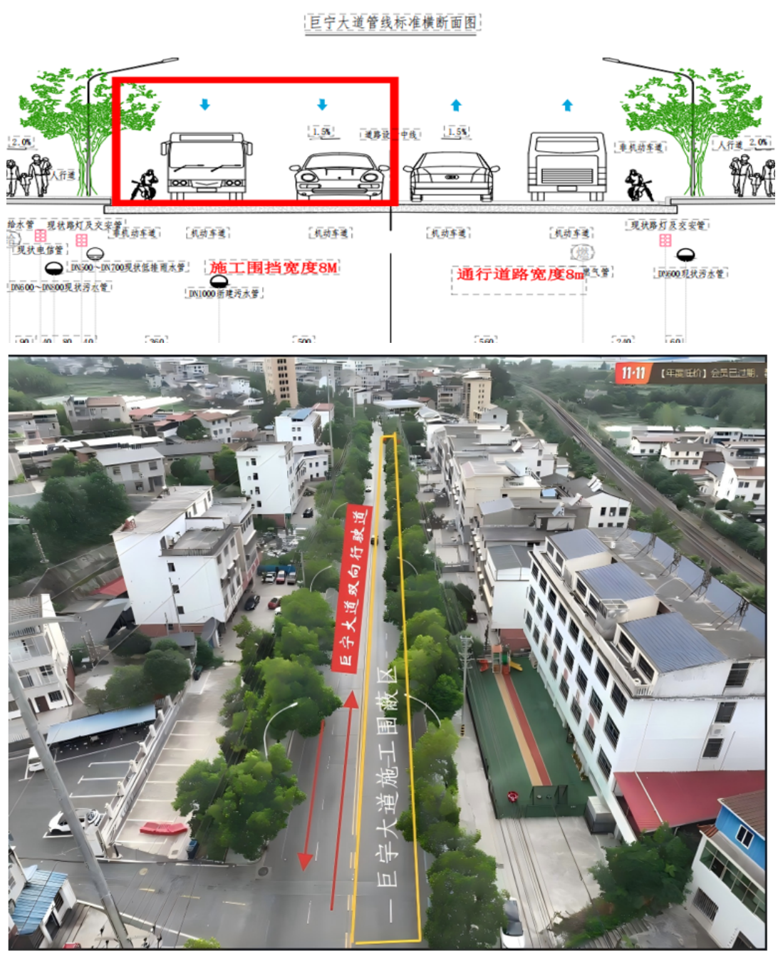 巨宁大道段:现状机动车道为16米宽双向4车道,路中设置隔离护栏。施工围挡占8米宽车道,道路剩余宽度8米,施工区域前方设置警示标识标牌。