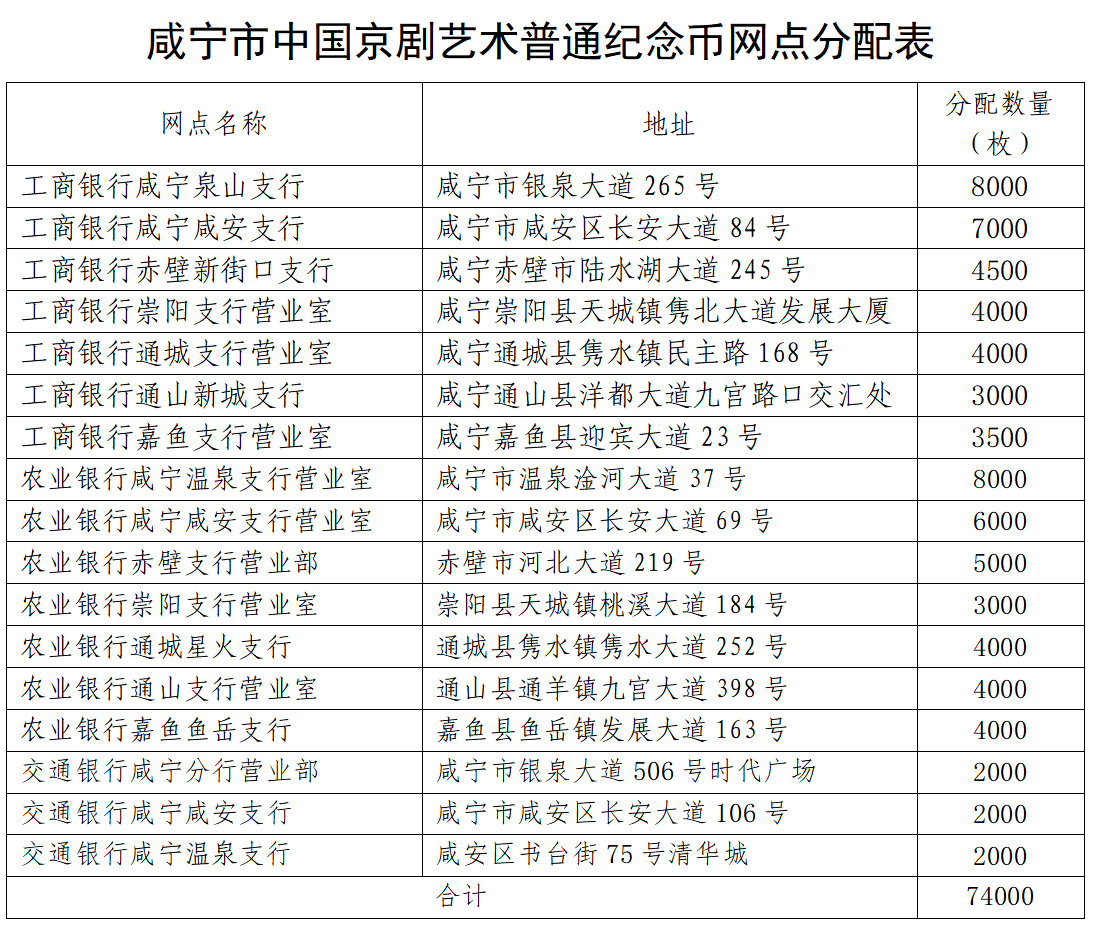 根据中国人民银行纪念币发行工作安排,中国京剧艺术普通纪念币(以下简称“京剧净币”)将于近期开展预约、兑换,京剧净币面额5元,咸宁市分配数量为74000枚。工商银行咸宁分行、农业银行咸宁分行、交通银行咸宁分行(以下统称预约承办银行)共同承担京剧净币在咸宁市的预约发行工作。