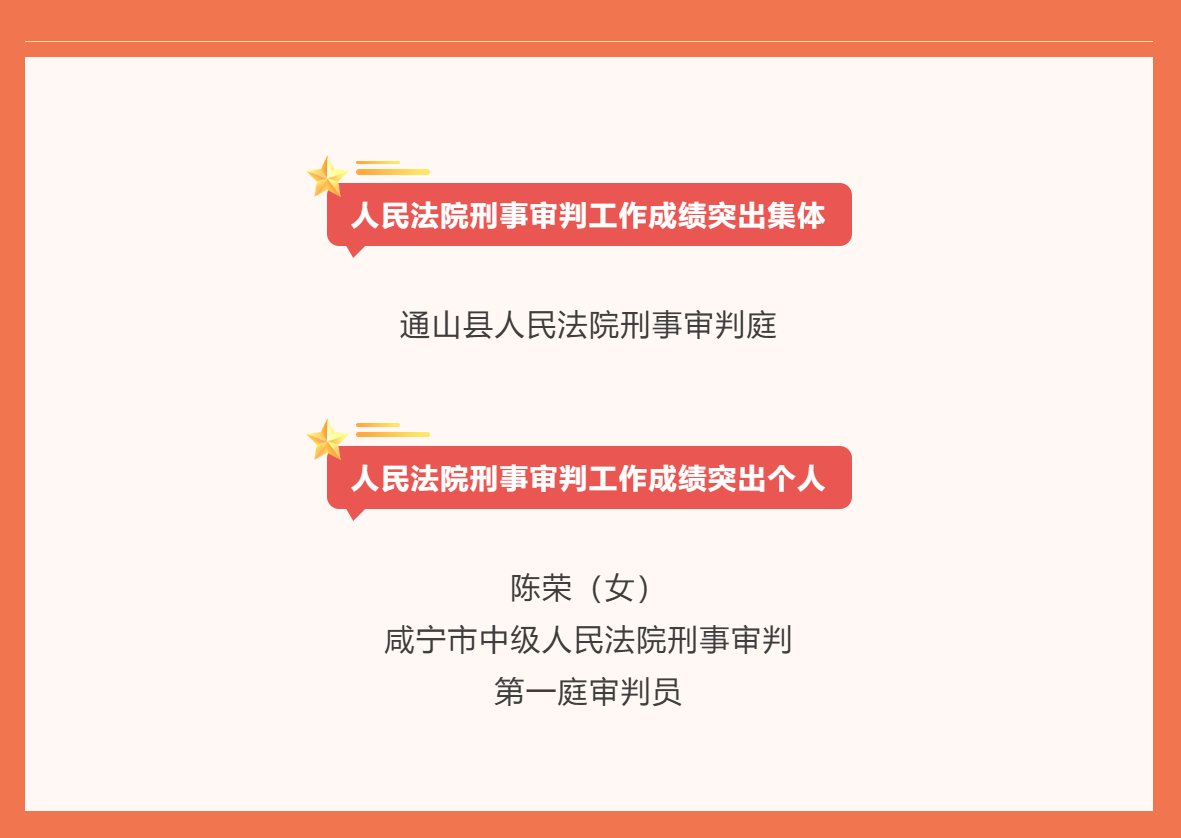 (云上咸宁编辑报道)为进一步加强人民法院刑事审判队伍建设,汇聚推动刑事审判工作高质量发展的强大动力,把平安中国建设推向更高水平。近日,最高人民法院印发《关于对人民法院刑事审判工作成绩突出集体和个人予以表扬的通报》,对全国法院147个集体、198名个人予以通报表扬。其中,咸宁法院1个集体、1名个人获表彰。