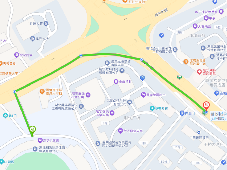华信农贸批发市场→肖桥村一组→崇文街→市实验中小学→但家湾→附二医院→桂花路加油站→(右转)岔路口→市妇幼保健院→市公路管理局→湖北科技学院口腔医院→锦绣城→湖北科技学院→鄂高→市中心客运站→居然之家咸宁店→茶园路→天洁国际城→浮山新村一组→浮山新村二组→咸宁国家高新区→旗鼓大道市民之家→金桂大道市民之家→黄鹤楼酒业→元气森林