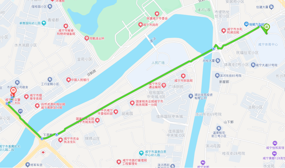 华信农贸批发市场→肖桥村一组→崇文街→市实验中小学→市电大→希望桥→铁疗→康泉预防接种门诊(老行署)→市邮政局→温泉中心花坛→市电力客户服务中心→温泉街道办事处→咸宁市第五小学→汉地尚街→(左转)三号桥→交警二大队→咸宁万达广场→(右转)黄畈社区→市老年大学(银桂路)→咸安档案馆→凯翔花园→市中心医院→高新区门楼→湖北金力→合加新能源→金桂大道市民之家→黄鹤楼酒业→元气森林→恒发检测站→咸宁市第二人民医院