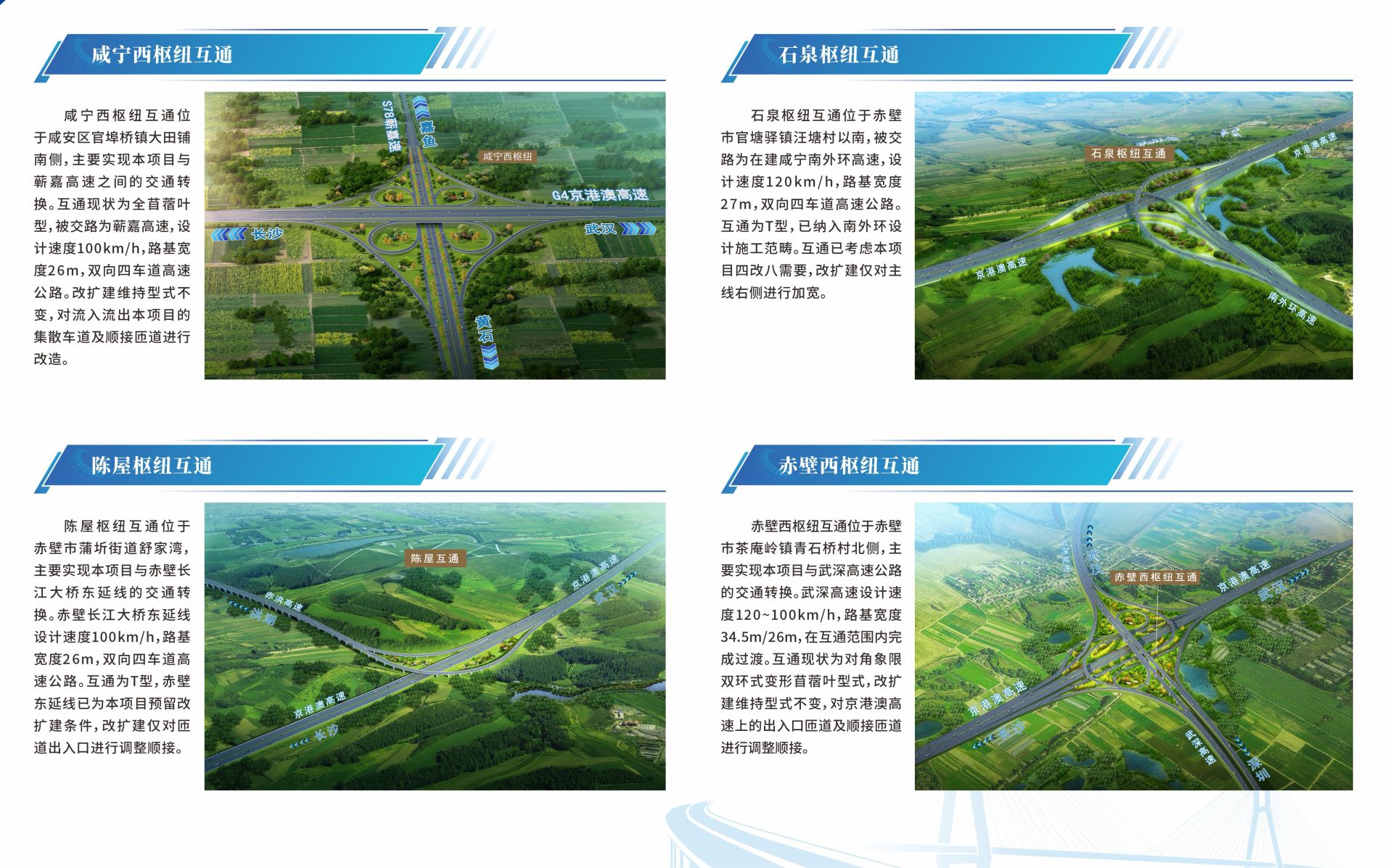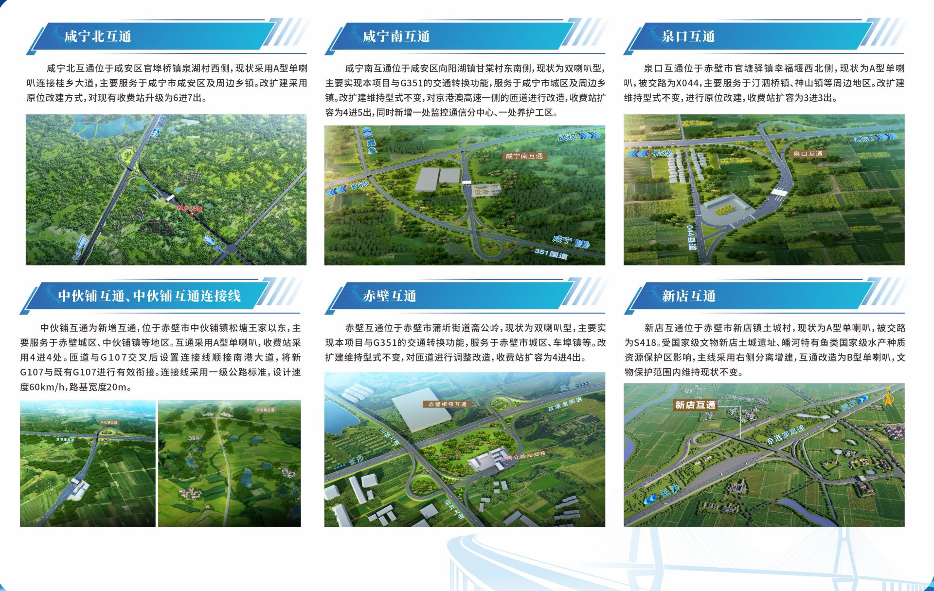值得一提的是,项目将在全线原位改扩建安山、咸宁北、咸宁西(枢纽)、咸宁南、泉口、赤壁、赤壁西(枢纽)、新店8处互通式立交,局部改造在建的山坡(枢纽)、石泉(枢纽)、陈屋(枢纽)3处互通式立交,同时新建段岭庙、山坡、中伙铺3处互通式立交。