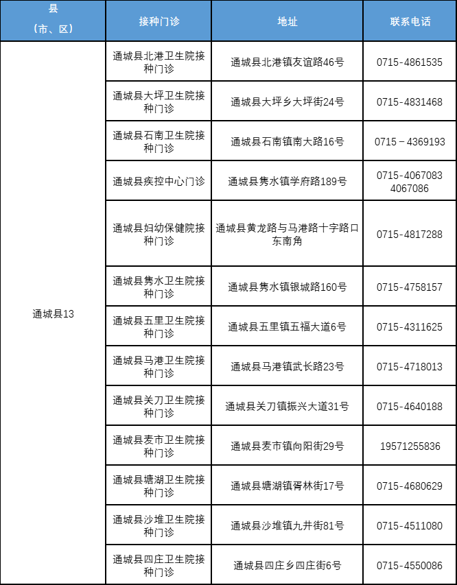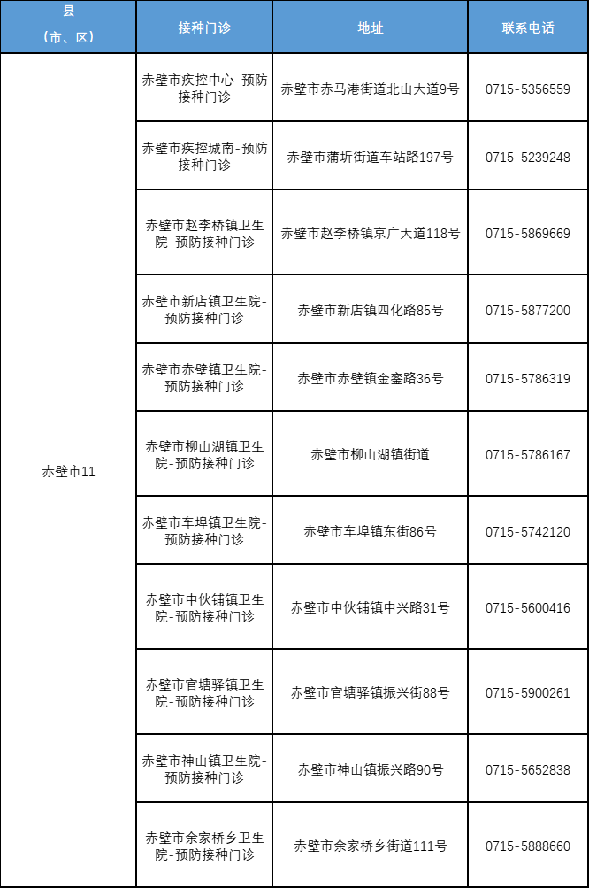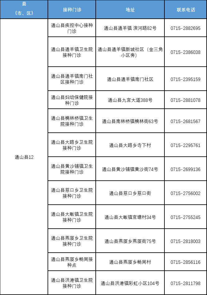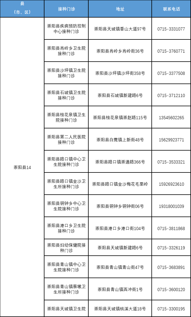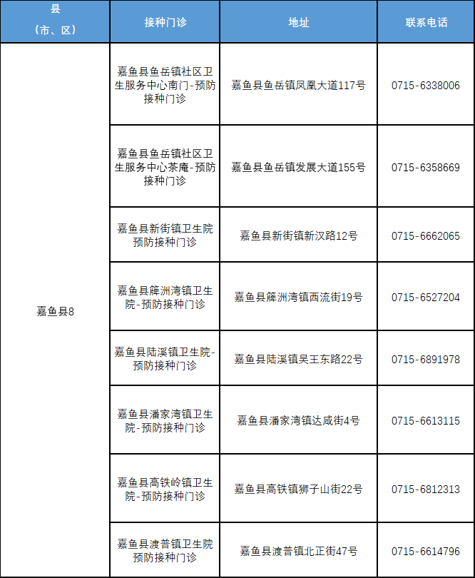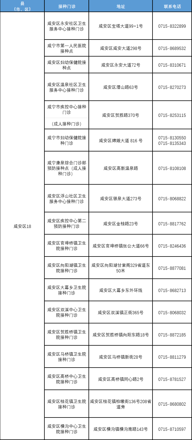 附:咸宁市流感疫苗接种门诊一览表