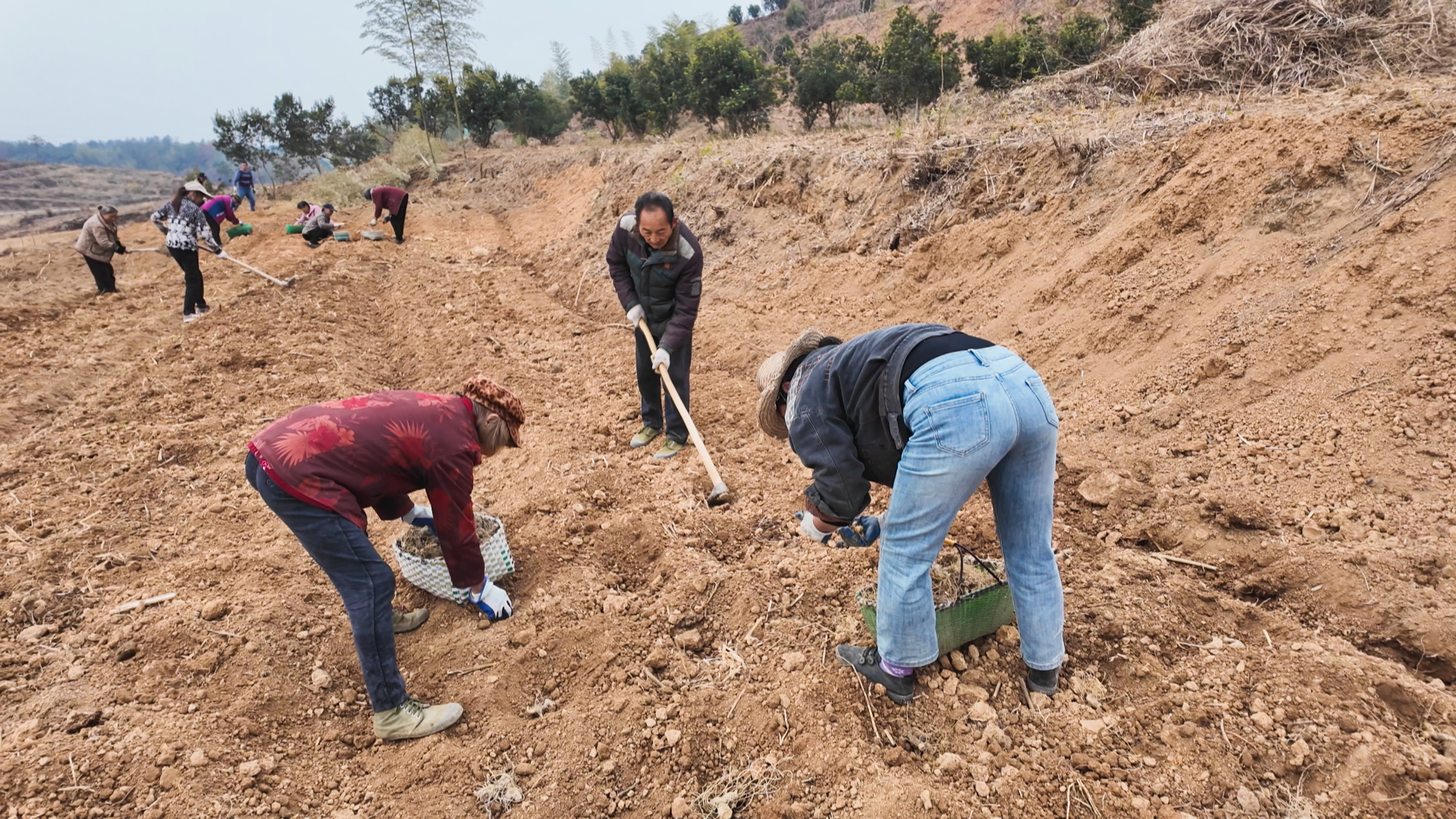 12月7日,崇阳县大塘村乌土山生态种养专业合作社的黄精种植基地一派繁忙。山坡上,机械轰鸣,基地正在清理荒地、平整土地,为规模化种植打好基础。不远处,数十名村民分工协作,抬着满筐黄精苗穿梭其间,弯腰挖穴、放苗、培土,动作娴熟连贯。