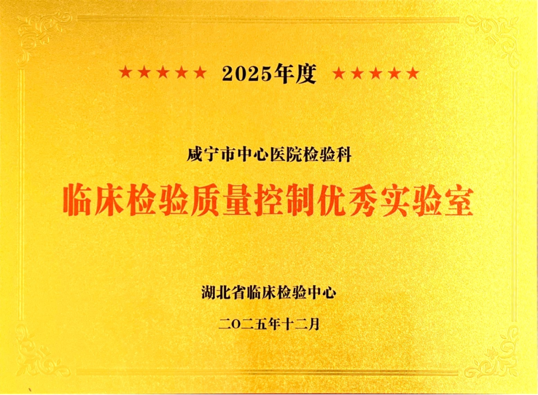 咸宁市中心医院检验科荣获“临床检验质量控制优秀实验室”称号,并获评科普大赛“市州优秀组织奖”;咸宁市临床检验中心被评为“临床检验质量管理优秀单位”;检验科主任朱建光荣获“临床检验质量控制先进个人”称号。