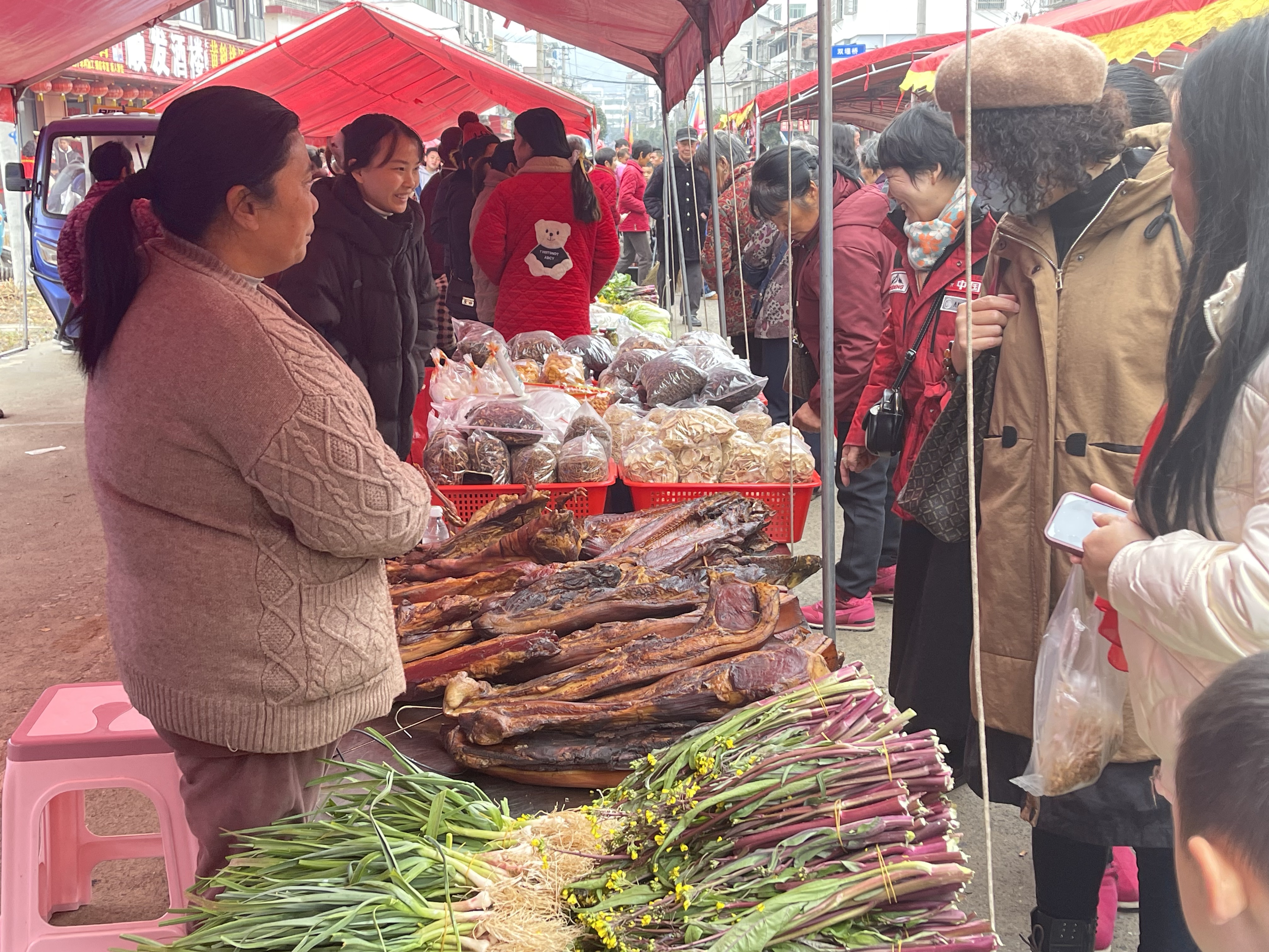 年货节现场一派节庆气象,特色腊肉色泽鲜润、手工炸丸飘香四溢,琳琅满目的时令果蔬、农家土蜂蜜、生态猪肉等本地优质农产品构成了一幅丰饶的乡村物产图。身穿志愿服务马甲的工作人员一边热情介绍产品的制作工艺与产地故事,一边帮助群众选购特色年货。