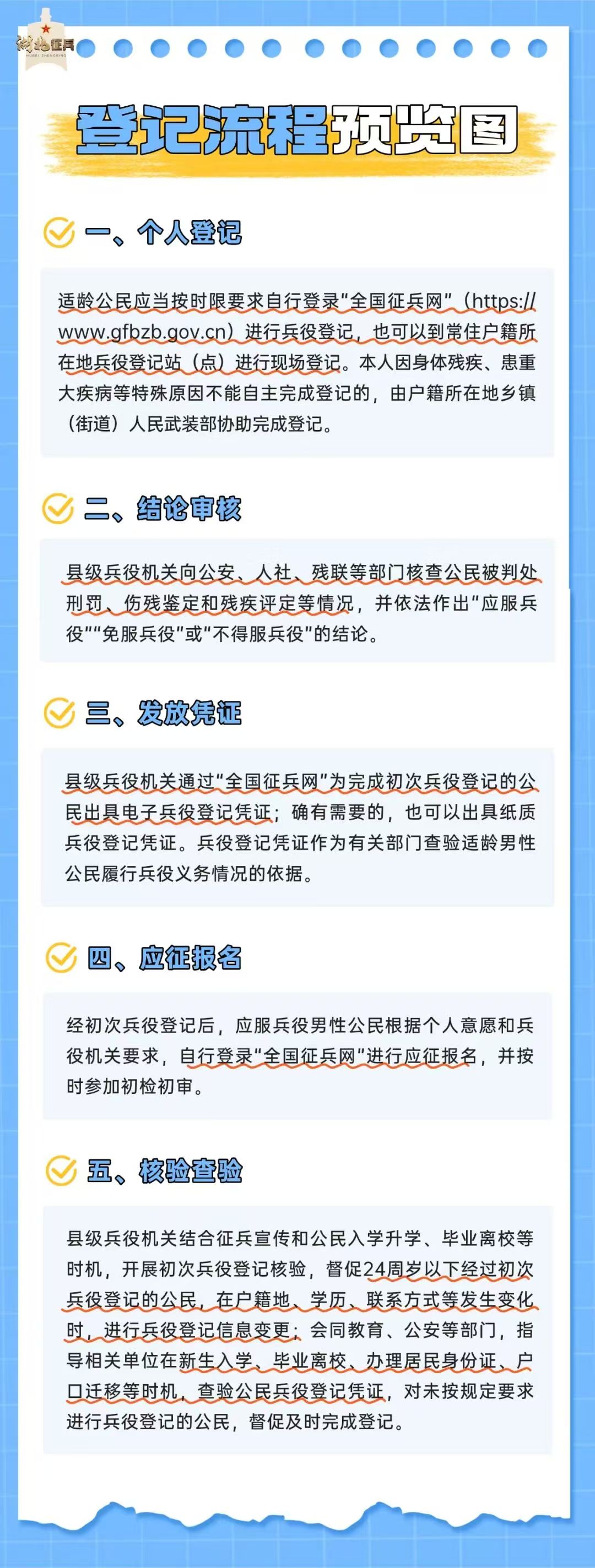 5.往年已参加兵役登记的,可登录“全国征兵网”对个人登记信息进行核验,符合应征年龄条件且有参军意愿入伍意向的,可参加2026年义务兵应征报名。