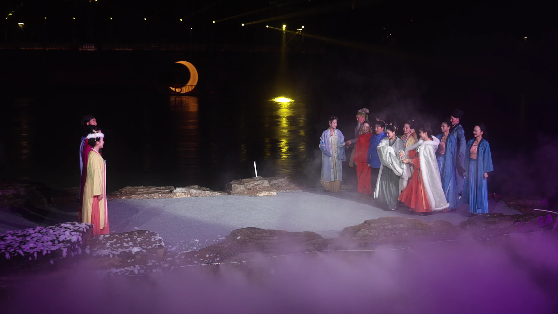 演出现场,温泉水汽氤氲,淦河两岸霓虹闪烁,营造出如梦如幻的氛围。整场演出时长约40分钟,以“冯京回乡省亲”为主线串联全篇,创新采用船型小岛与游船作为移动舞台,巧妙借势潜山、曲水、温泉等自然景致,通过《扁舟谣》《月亮湾迎客歌》等特色歌舞,生动展现咸宁温泉的独特魅力、浓郁民俗风情,以及桂乡人民热情好客、昂扬向上的精神风貌,尽显宋代古城永安的风华韵味。