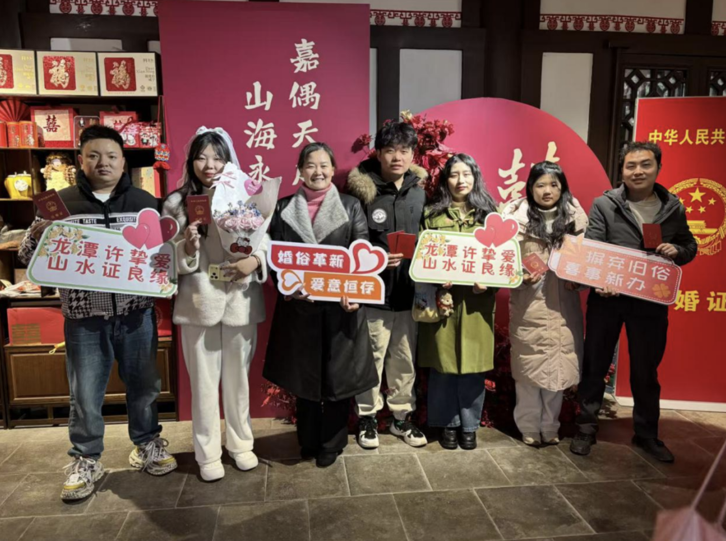 “在这么美的风景里完成人生大事,感觉特别有意义!”一位新人代表说出了大家的共同心声。将婚姻登记与景区文化相结合,不仅增强了仪式感,也传递了婚事简办、重情轻礼的现代婚恋观。