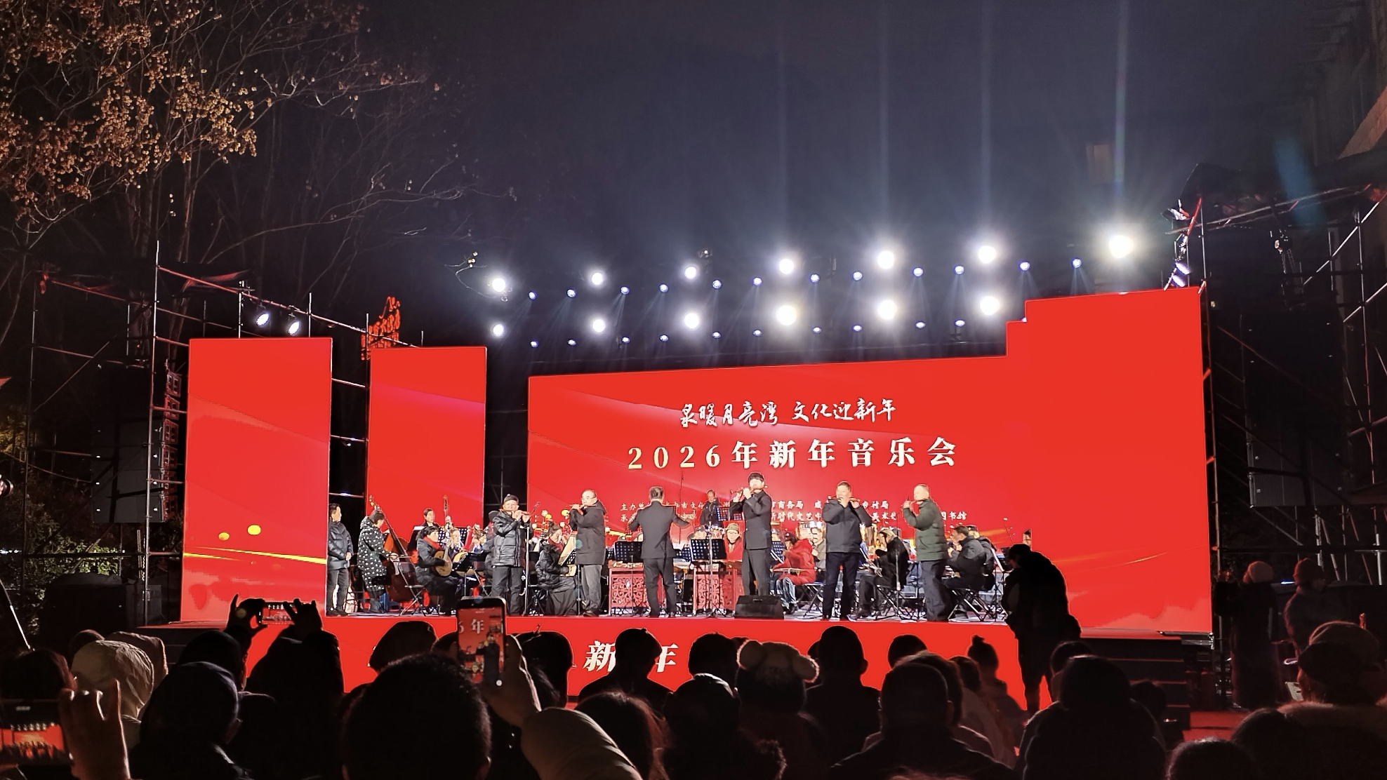 在温泉谷酒店温泉食尚门前广场,2026年新年音乐会同步举行,舞台被观众层层围绕。武汉梦想民族管弦乐团带来了《我爱你中国》《红色娘子军组曲》《东方红》《我的祖国》《奔腾2026》等12个精彩节目,艺术家们以精湛的演绎,为市民营造了一个美妙难忘的新年之夜。
