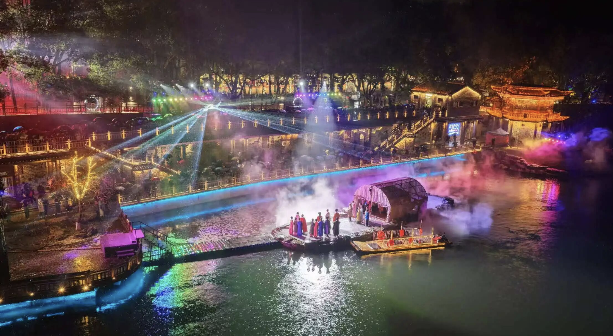 1月1日晚,记者来到月亮湾,现场游人如织,气氛热烈。濯足廊前的“温泉沸波”实景演出吸引了大量游客驻足观看。演出巧妙利用船型小岛与游船作为移动舞台,依托潜山、曲水、温泉等自然景观,通过《扁舟谣》《月亮湾迎客歌》等特色歌舞,生动展现了咸宁温泉的独特魅力、浓郁的民俗风情,以及桂乡人民热情好客、昂扬向上的精神风貌,再现宋代古城永安的风华韵味。据悉,该演出最后一场将于1月2日18:30上演,市民可前往免费观看。