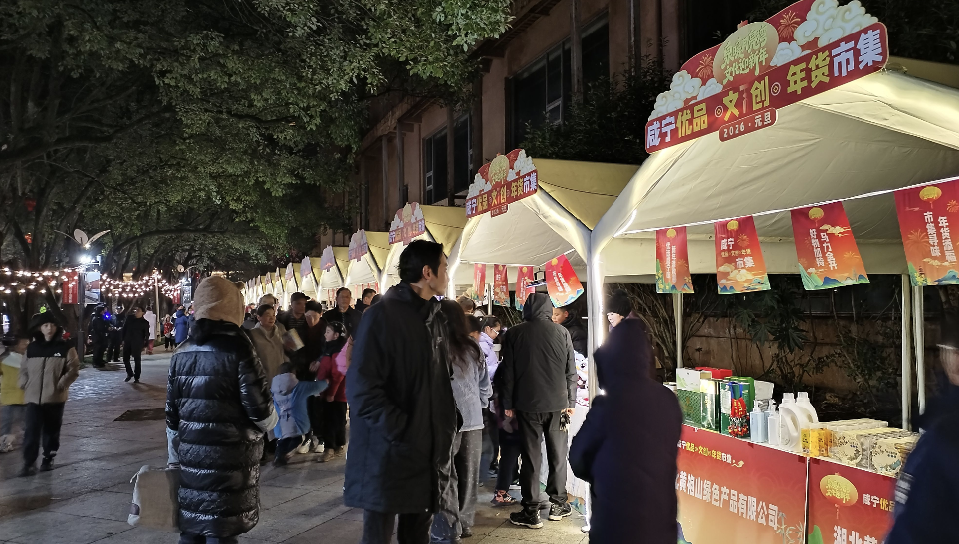 舞台周边还设有咸宁优品文创年货市集,汇集了咸宁名优特产、地道美食、非遗工艺品及创意文创产品,同样吸引众多市民驻足选购。