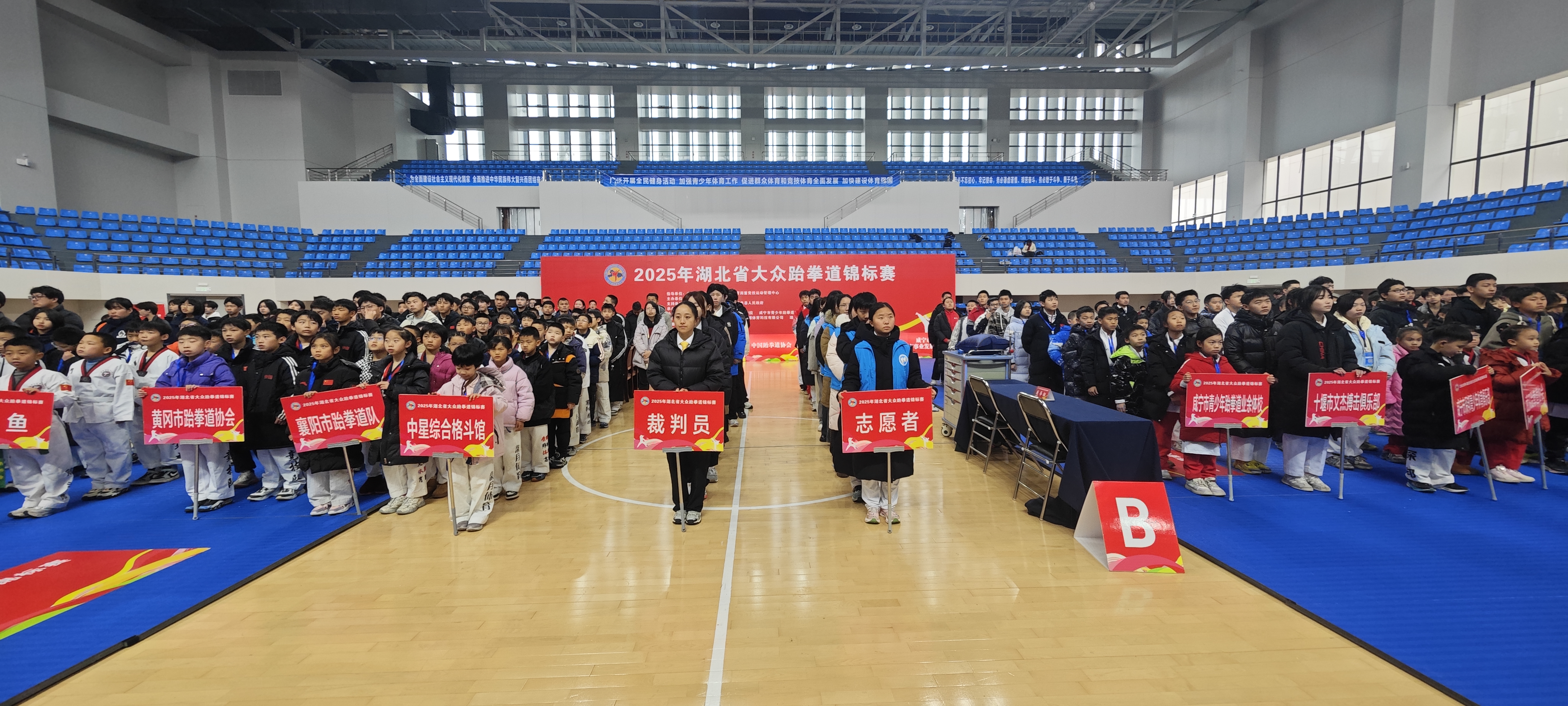云上咸宁报道(记者 张聪 通讯员 黄松海 嘉鱼县融媒体中心记者 郭辉)1月2日下午,2025年湖北省大众跆拳道锦标赛在武汉东湖学院嘉鱼校区体育馆举办开赛仪式,这场横跨元旦假期的体育盛会,将全省17个市州25支代表队的550余名领队、教练、运动员与技术官员汇聚一堂,以“礼义、廉耻、忍耐、克己、百折不屈”的跆拳道精神,为新年注入青春活力。