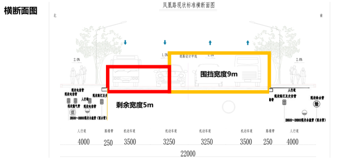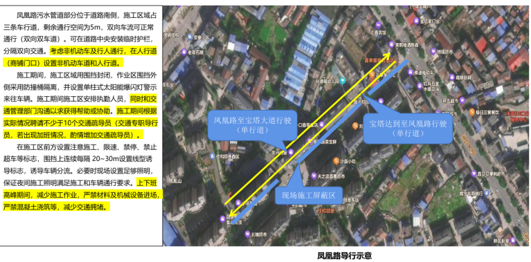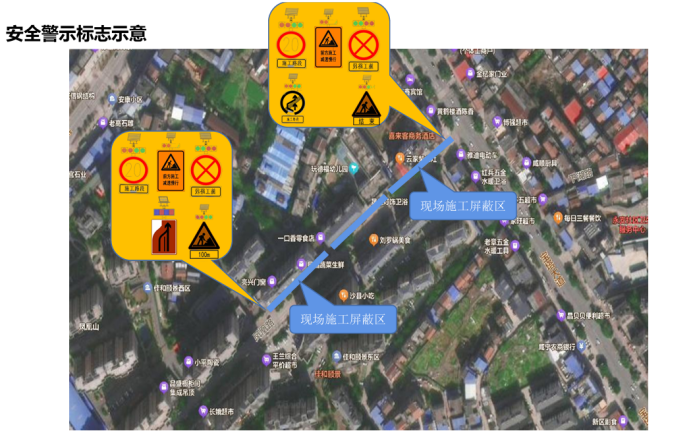 实施方案:施工围挡占9米宽车道,剩余宽度5米,东西方向各一个车道,施工区域前方设置警示标识标牌。