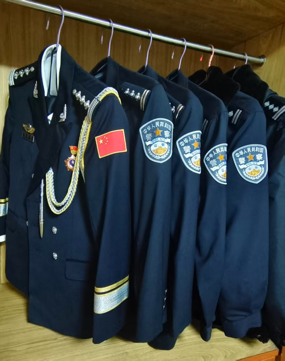 旧制服的领口别着那枚领带夹,袖口细密的针脚是妻子当年加班加点缝补的印记;执勤服左胸口袋边缘微微起毛,那里曾常年别着一支用惯的钢笔,记录过无数晨昏的工作日志;作训服后背洇着浅色汗渍,叠印着夏季街面42℃高温下的坚守;而那件洗得泛白的春秋常服,衣袖左臂臂章上“中华人民共和国警察”等标志依然醒目——虽已起皱,却历久弥新,越发清晰如昨。