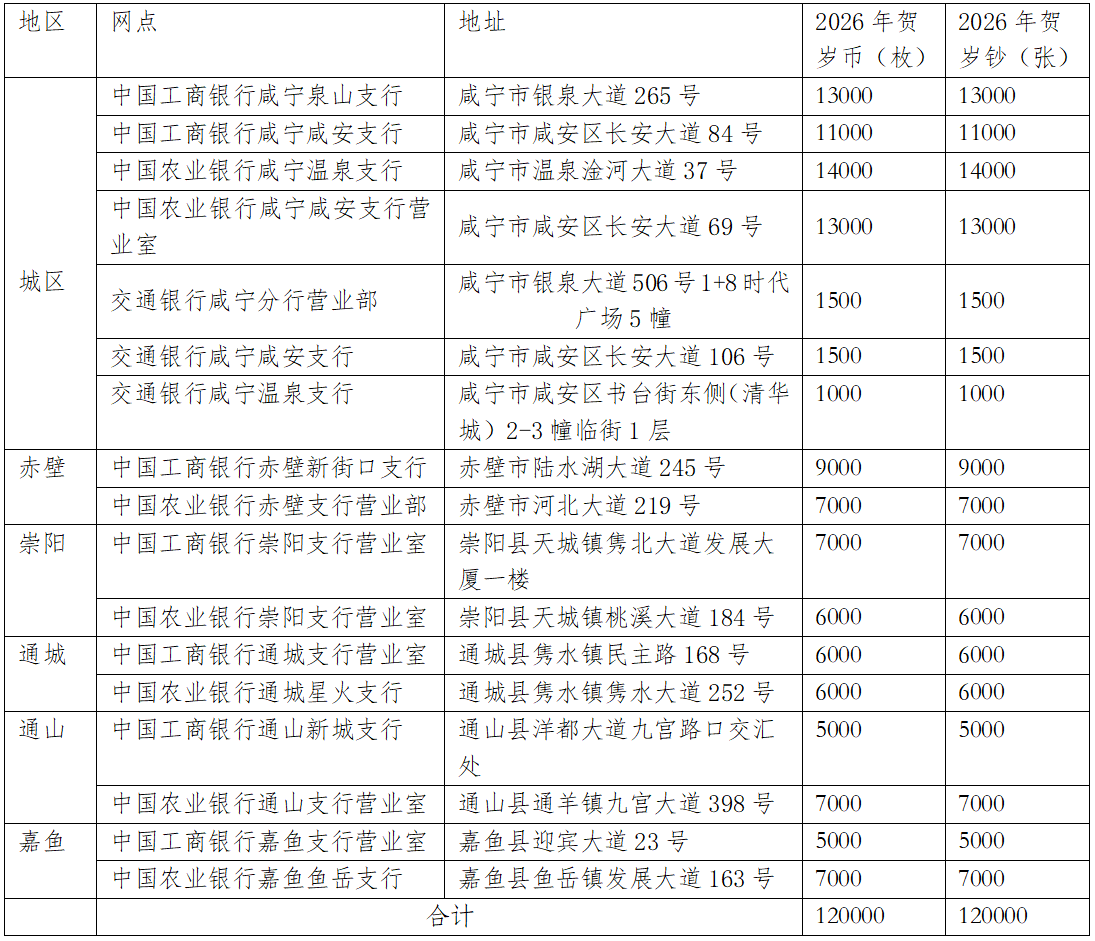 咸宁市2026年贺岁币、2026年贺岁钞网点分配表
