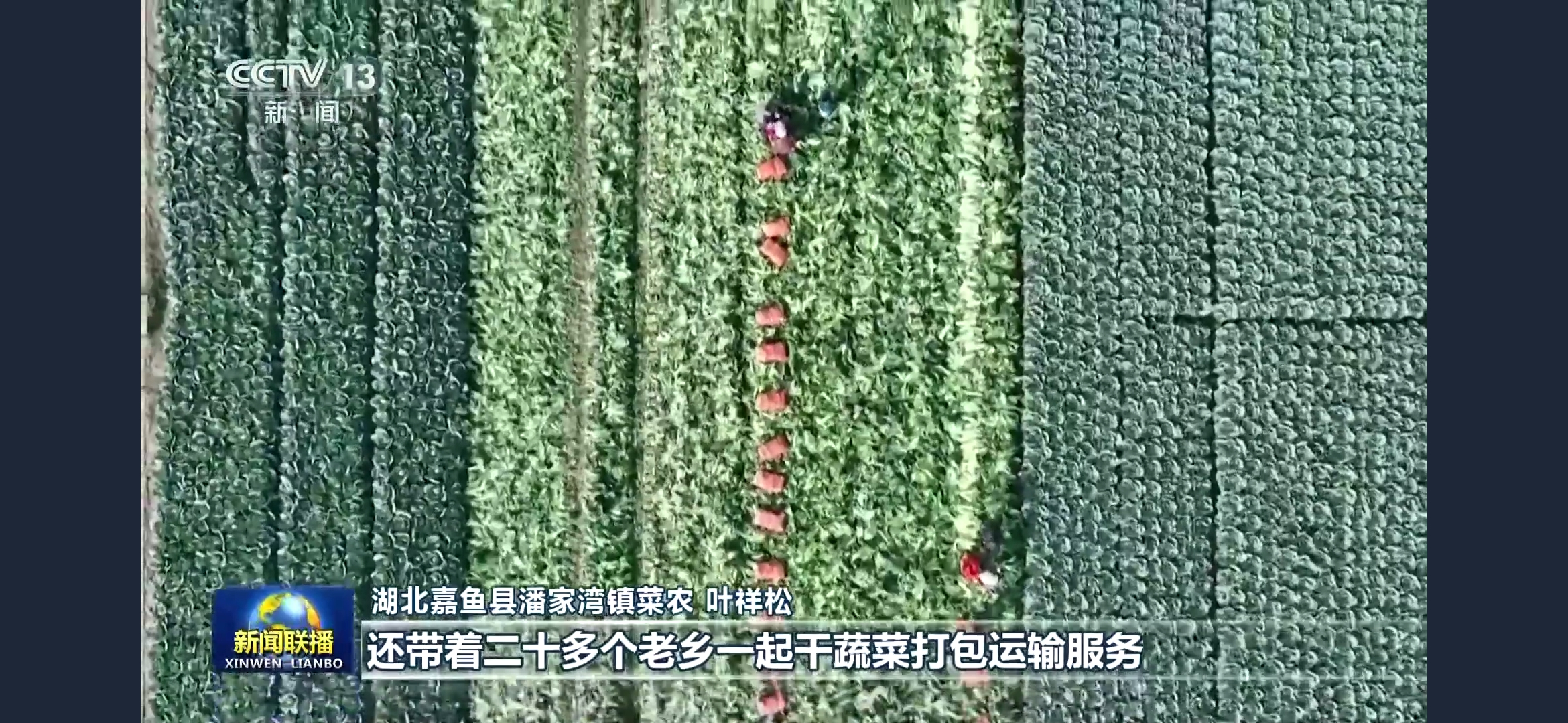 湖北嘉鱼潘家湾镇十里蔬菜长廊里,甘蓝菜喜获丰收,村民们正忙着采摘、销售。2024年11月,习近平总书记来到这里考察,勉励大家把蔬菜种植这个富民产业做好,菜农叶祥松当时就在场。
