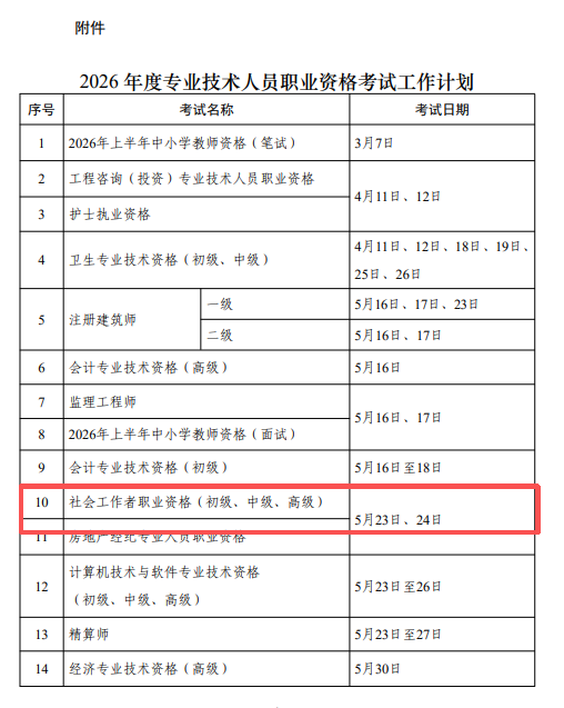 以下为附件截图,2026年社会工作者职业资格(初级、中级、高级)考试时间为: 5月23日、24日