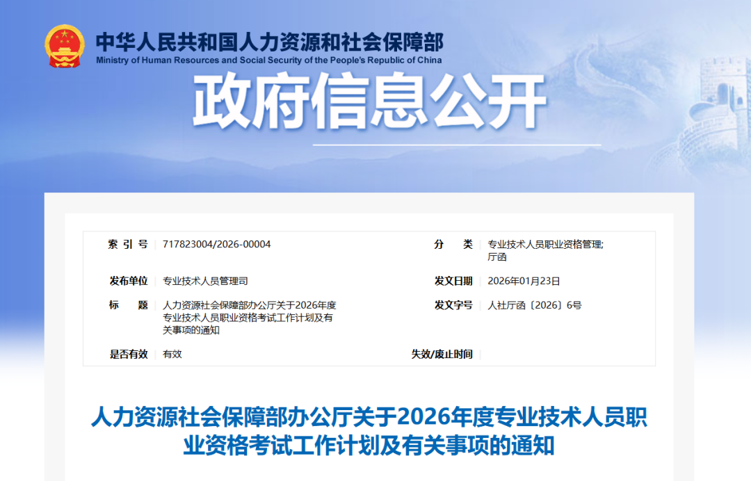 (云上咸宁编辑报道)1月23日,人力资源社会保障部办公厅发布2026年度专业技术人员职业资格考试工作计划及有关事项的通知,通知原文如下: