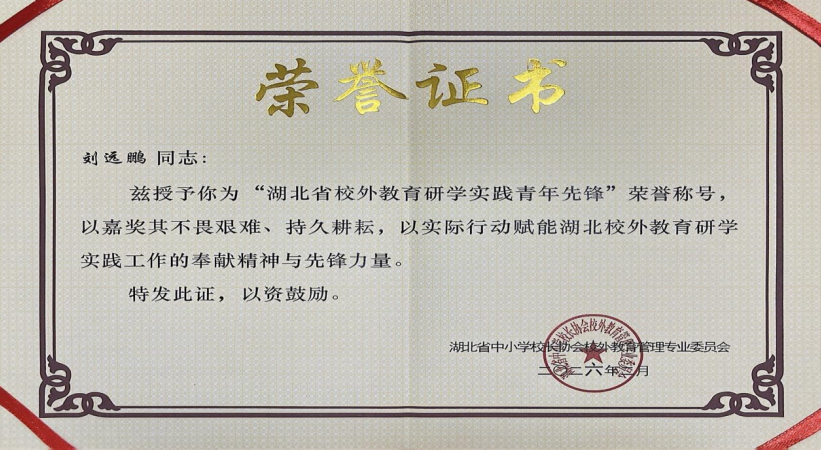 集团董事长刘远鹏获评“湖北省校外教育研学实践青年先锋”。其带领团队积极推动“教育+科技+实践”融合创新,为校外教育高质量发展注入活力。集团旗下湖北幕阜山体验教育有限公司(湖北幕阜山研学营地)、集团与赤壁城发集团合资成立的赤壁研学小镇营地均被评为“2025年度湖北省校外教育工作先进单位”。湖北幕阜山研学营地校长张克俭荣获“湖北省校外教育先进个人”称号。