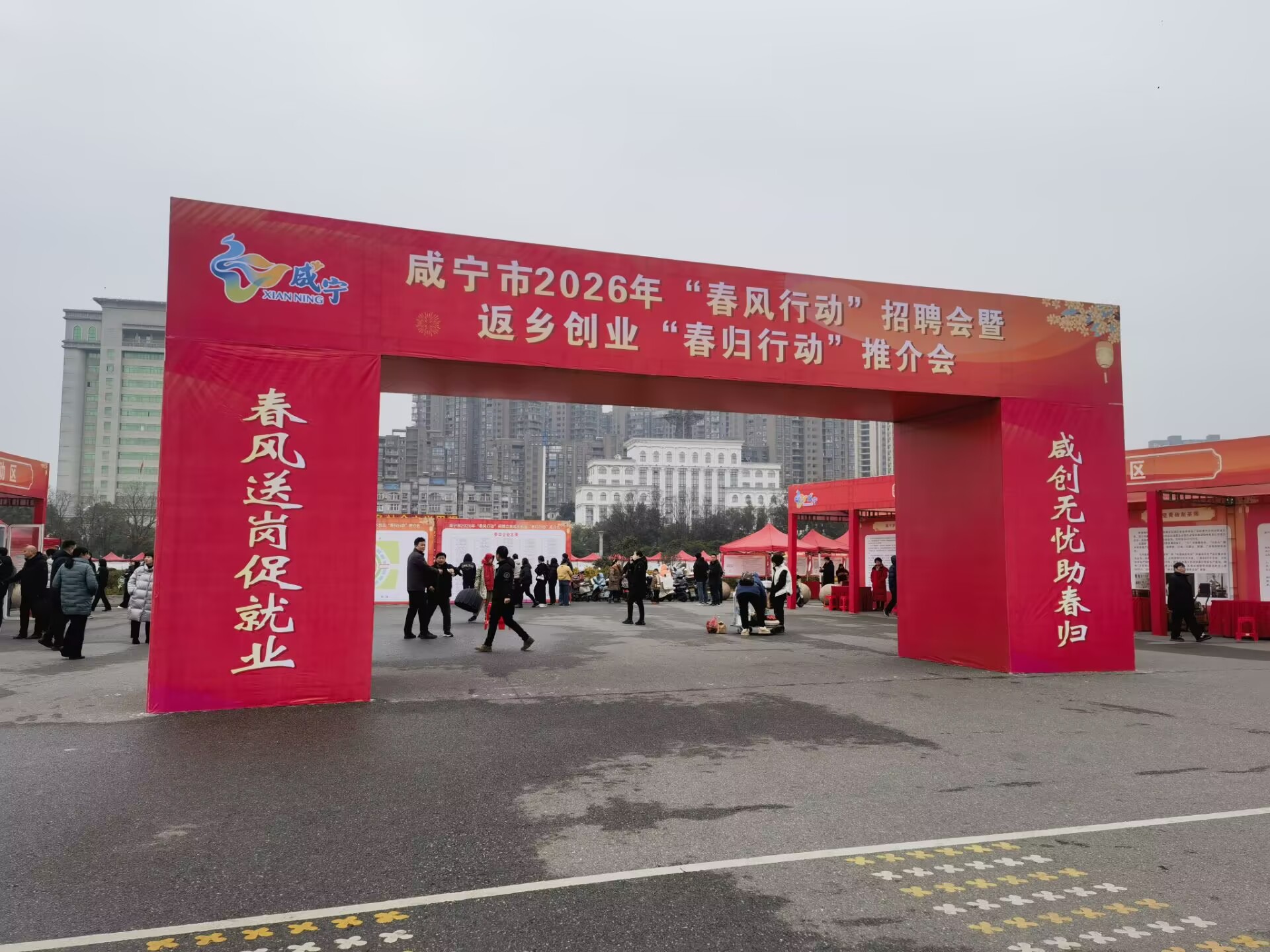 云上咸宁报道(记者 李华荣 樊瑞)2月10日,咸宁市人民广场人声鼎沸。一场以“‘春风’送岗促就业·咸创无忧助‘春归’”为主题的大型招聘会暨返乡创业推介会火热开场,拉开了咸宁市2026年一季度就业创业服务“开好局、起好步”的序幕。