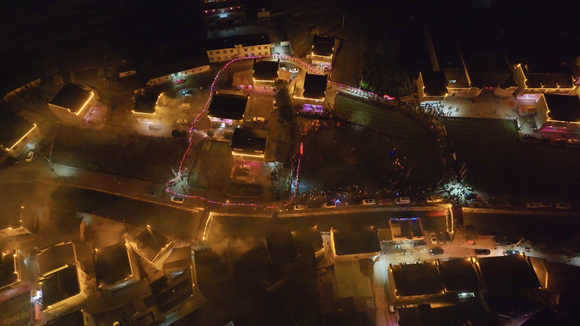 板凳龙蜿蜒起伏、栩栩如生,灯光映照下,龙身熠熠生辉,伴随着锣鼓声和欢呼声,穿梭在古街巷中,途经王氏老屋、老宗屋等核心古民居时,龙头朝向古宅致意,寓意龙气护佑古村。游客和村民们手提火把和小灯笼,跟在游龙队伍后面,欢声笑语回荡在古村的夜空。