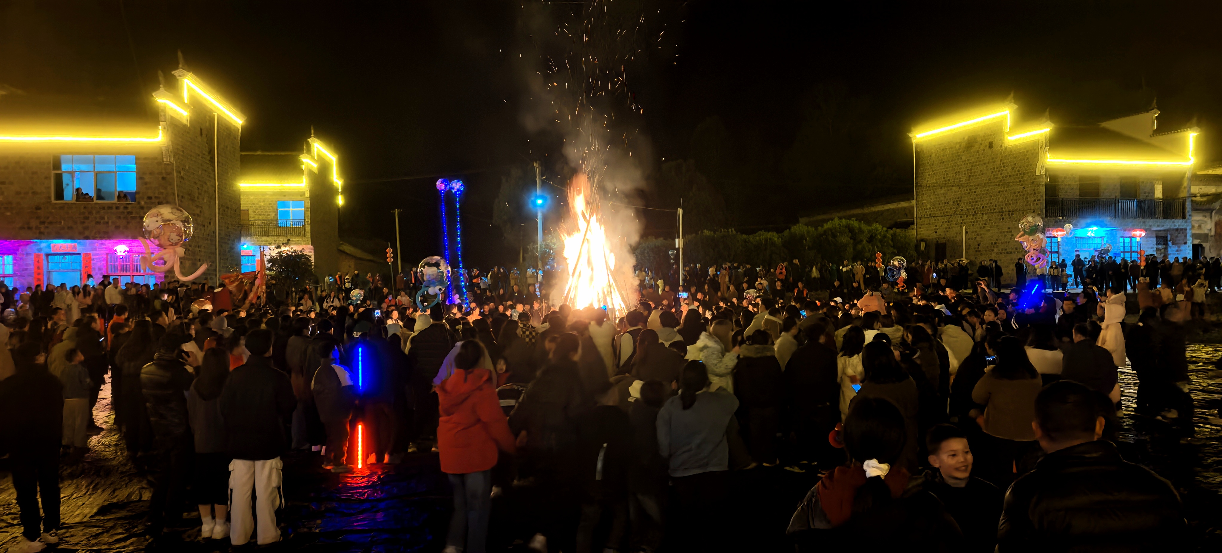 巡游结束后,王氏老屋右前方的开阔地上,篝火晚会正式点燃。“薪火相传”点火仪式启幕,熊熊篝火冉冉升起,村民和游客手拉手围着篝火跳舞、拉歌,欢声笑语不断。随着烟花绽放夜空,璀璨的烟花照亮了古村,也照亮了村民们幸福的笑脸,整个古村变成了欢乐的海洋。