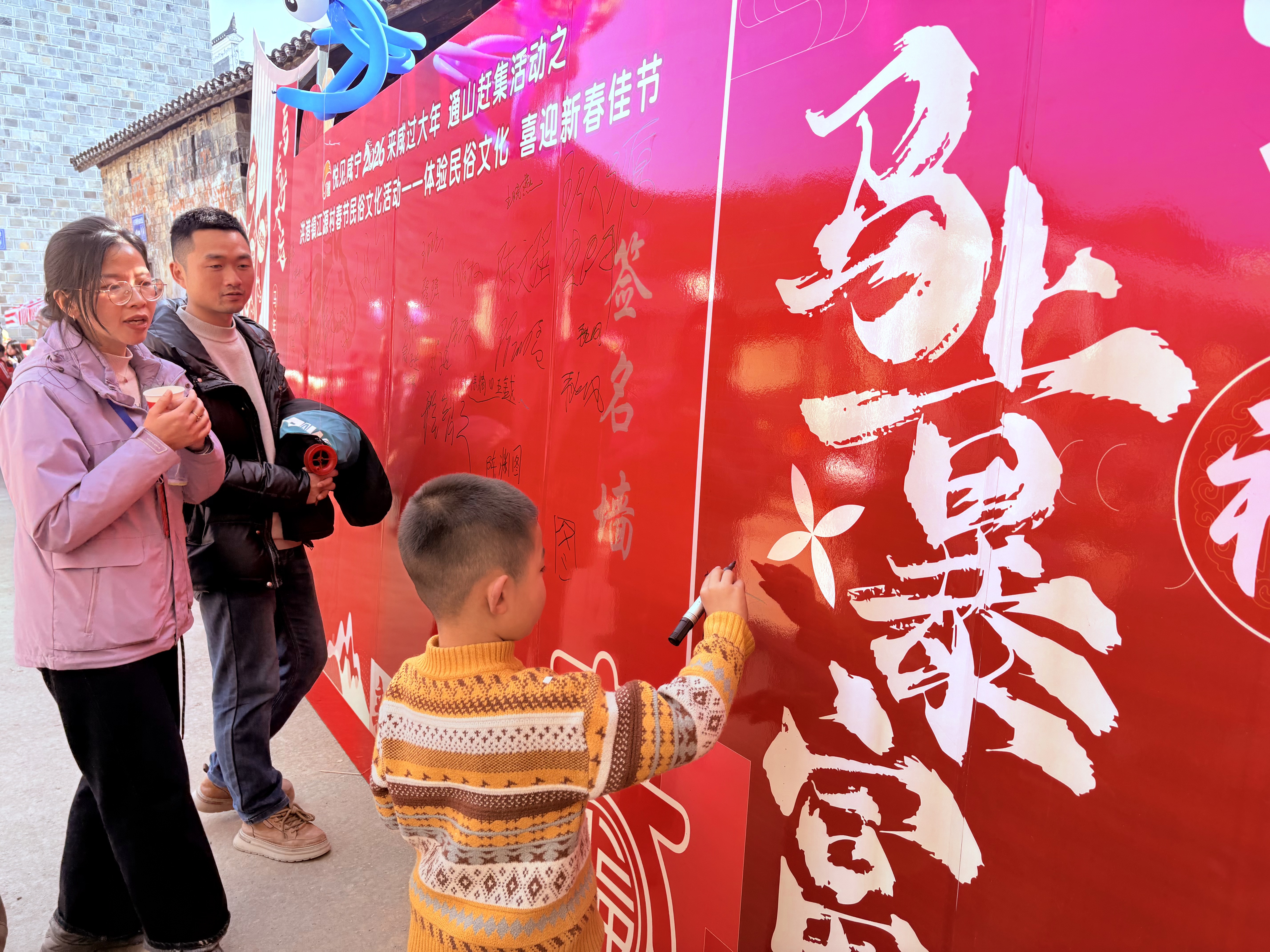 “每年过年最盼的就是这手写的春联,有墨香、有年味,贴在门上,年味儿一下子就浓了。”正在领取春联的江源村村民王大爷笑着说,他特意选了两副春联,一副贴在自家老屋门上,一副留给返乡的儿子。作为土生土长的江源村人,王大爷见证了古村的变迁,“以前过年就是一家人吃顿饭,现在活动越来越多,写春联、逛市集,比城里还热闹。”