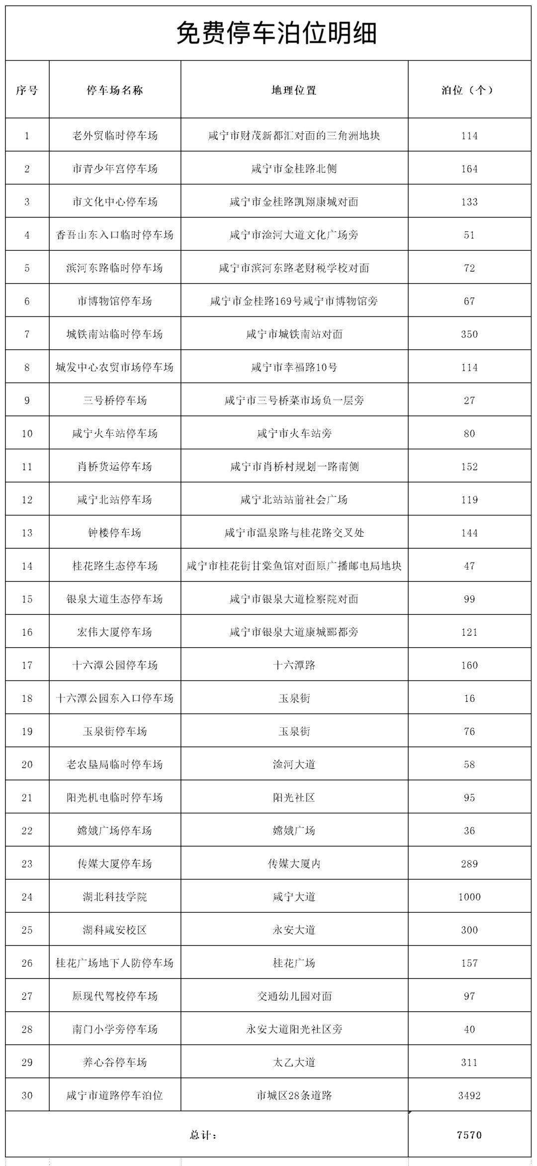 免费开放地点:“咸宁智慧停车”项目所运营管理的28条道路、29处停车场,共计7570个泊位全部免费对外开放。