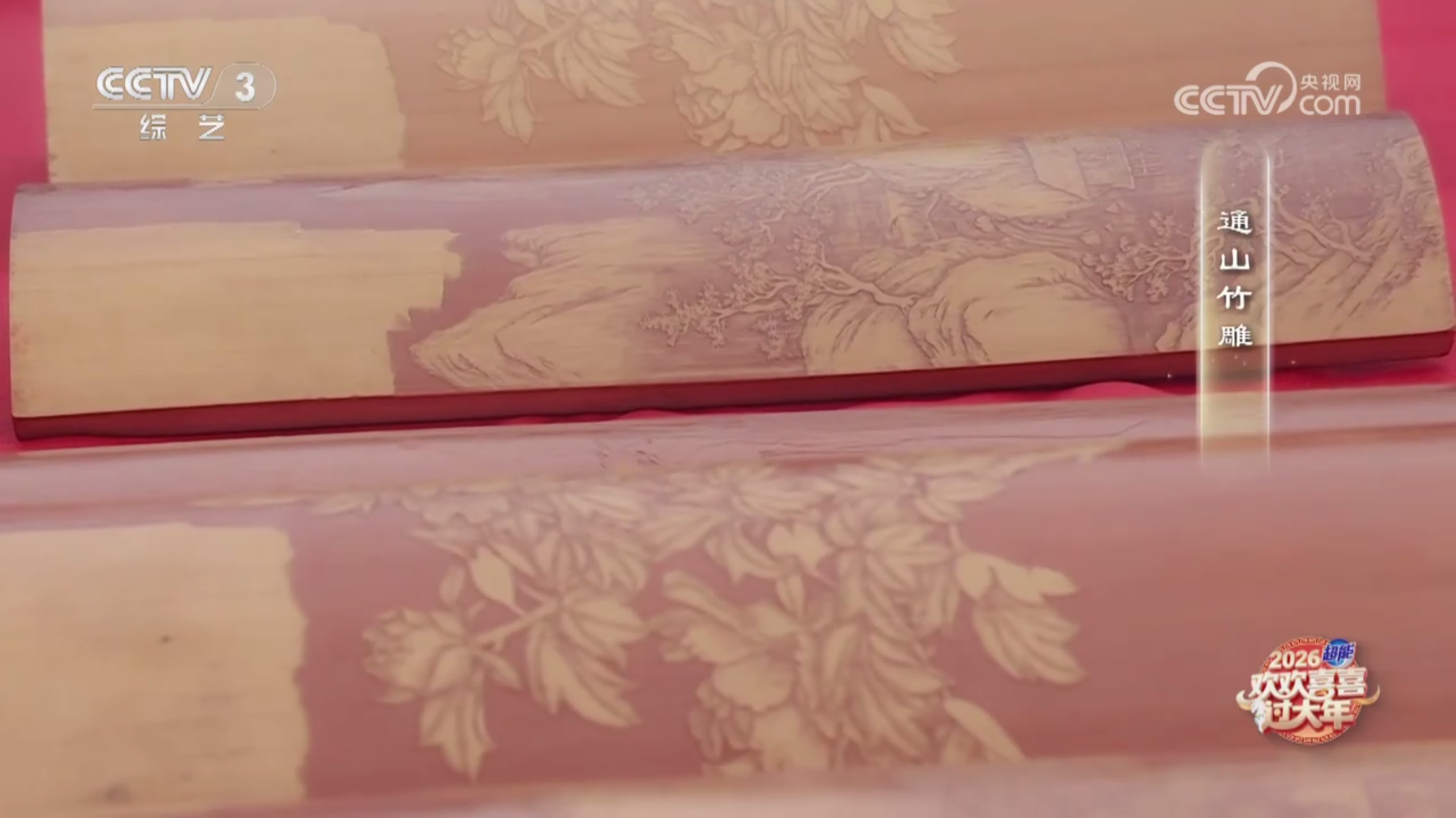 节目舞台上,央视主持人高浩森、依利米努尔·艾麦尔江向全国观众推荐咸宁非遗好礼——通山竹雕。