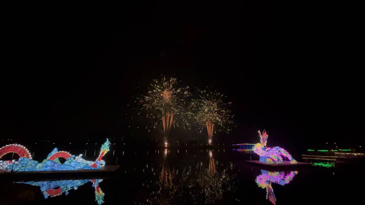 夜幕降临,近百组非遗花灯依次点亮,唐风宋韵灯组与桂花、嫦娥、状元等本土文化元素交相辉映,湖面波光与灯火相映成趣,水陆空全景沉浸式灯海美不胜收。现场民俗演艺、烟花秀、水上表演、互动游艺轮番上演,美食市集香气四溢,欢声笑语此起彼伏。