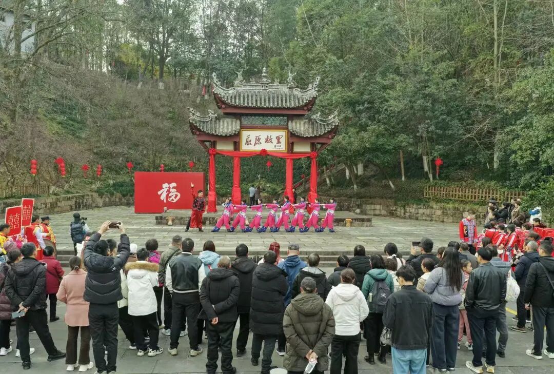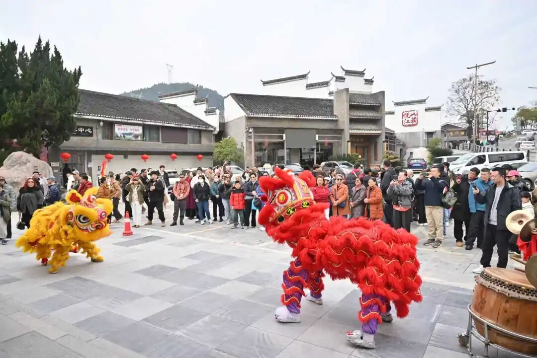 大年初三,夷陵三游洞景区现场舞狮表演气氛活跃,游客争相合影留念
