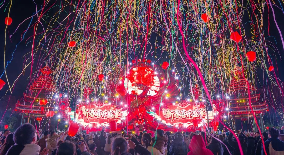 春节年味上新!咸宁市太乙天沐温度假区,天河金丝龙巡游、篝火晚会、非遗火壶、沉浸式NPC互动,热闹过大年