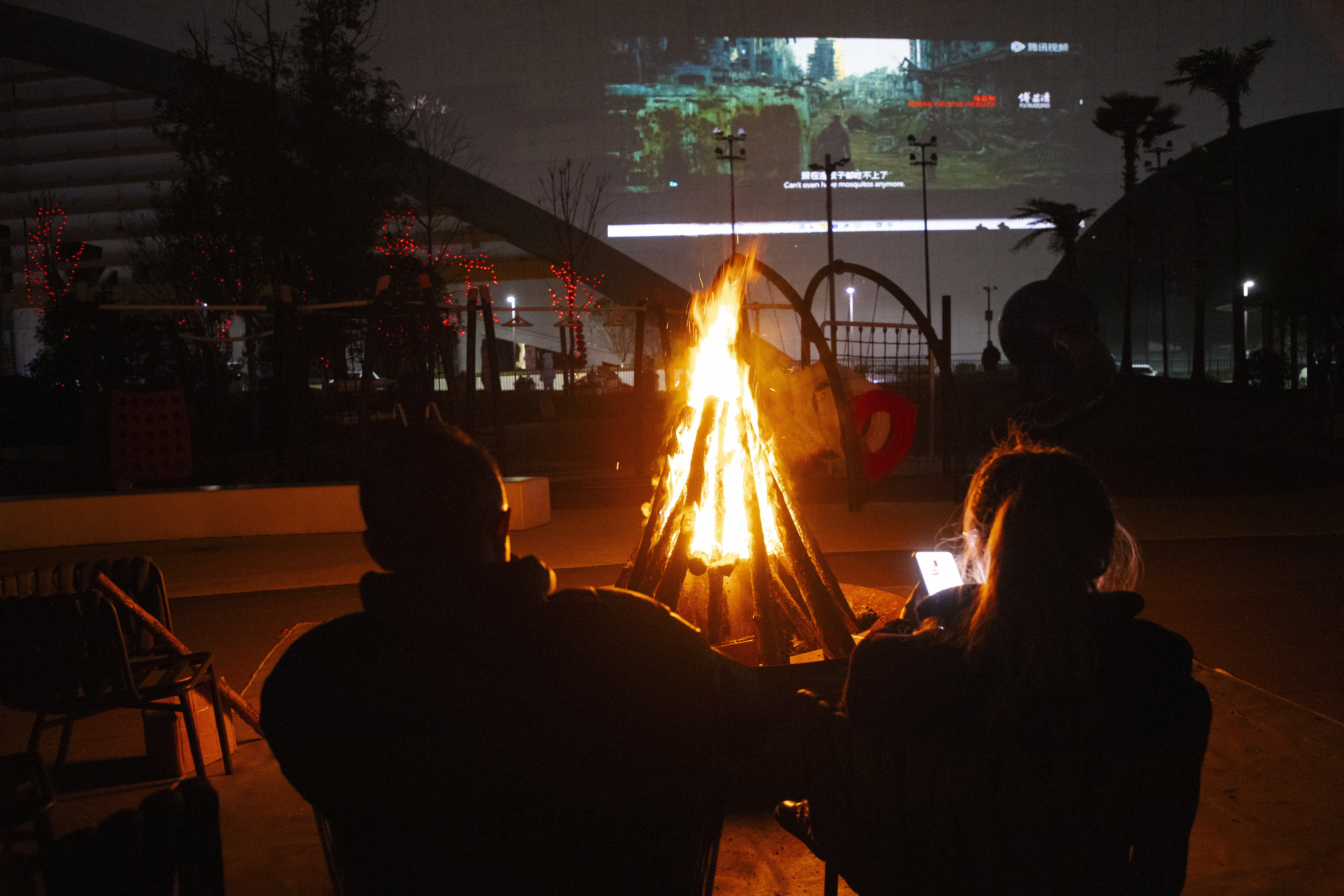 夜幕降临,活动的主场悄然转移至梦幻水世界。熊熊篝火燃起,巨幕投影亮起,游客们围坐在火堆旁,一边“围炉煮茶”,一边观看贺岁大片。火光映照在每个人脸上,驱散了冬夜的寒意,也拉近了彼此的距离。从武汉自驾来的游客张先生一家感叹:“白天滑雪看马戏,晚上还能围着篝火看电影,这种年味很新鲜,孩子说这是最难忘的春节。”
