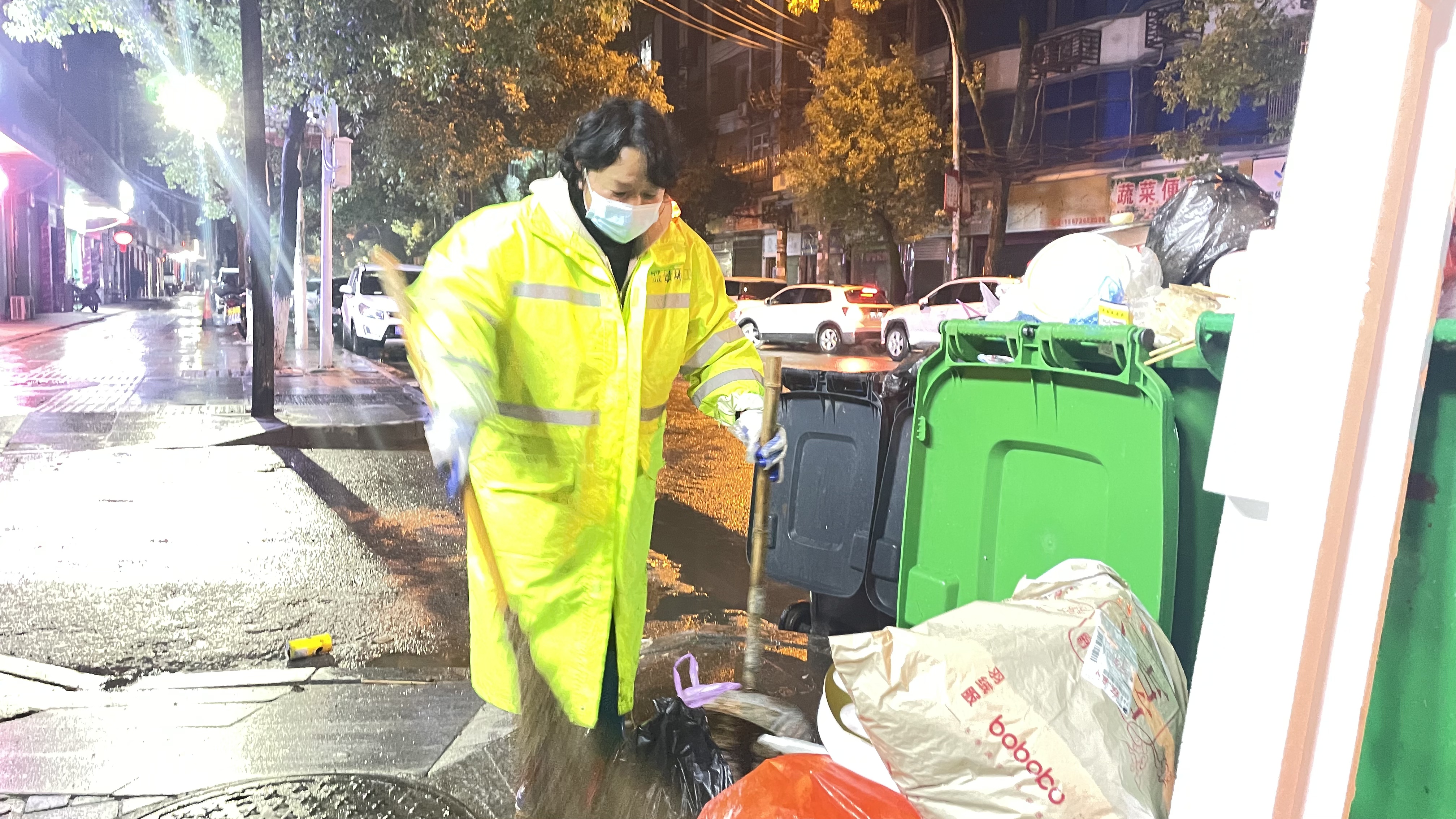 在城区的主次干道上,一辆辆垃圾清运车往来穿梭。司机杜秋甫驾驶着清运车在各个收集点之间“折返跑”。“清运的线路是固定的,但每个点的垃圾量都比平时翻倍。”杜秋甫说,为了确保垃圾桶不满溢,他们增加了清运频次,原本一天收两趟的点位,当天可能要跑四五趟。