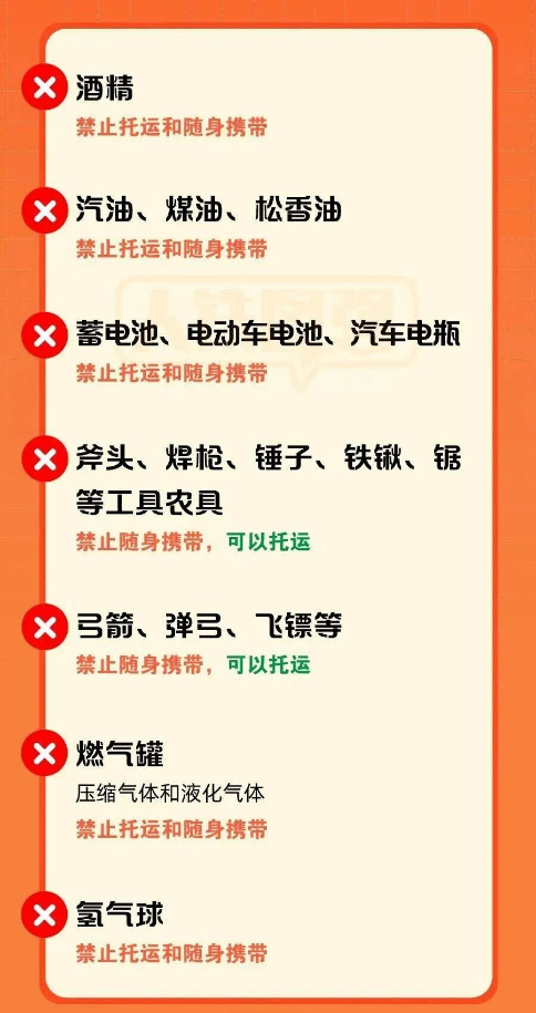 ❌️汽油、甲醇汽油、乙醇汽油、柴油、煤油、油纸、油漆、松香油等不能带上火车。