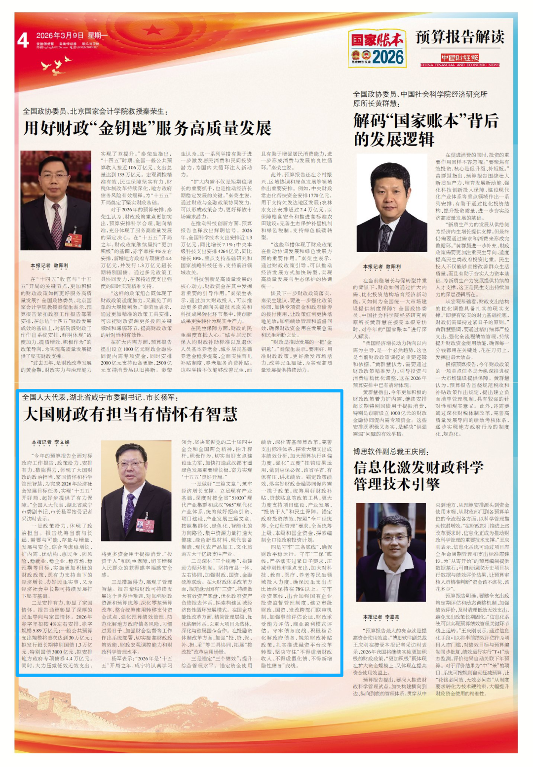 “今年的预算报告全面对标政府工作报告,政策给力、安排有力、措施得力,体现了大国财政的政治担当、家国情怀和科学管理智慧,为完成2026年经济社会发展目标任务,实现‘十五五’开好局、起好步提供了有力保障。”全国人大代表,湖北省咸宁市委副书记、市长杨军接受记者采访时表示。