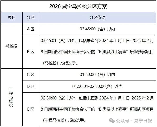 1.请仔细查阅前文的分区依据,如果您的分区与分区依据的成绩不符,请发邮件至组委会邮箱xianningmarathon@163.com(邮件标题为“申请分区调整”,邮件内容需要包含姓名、身份证号码、联系方式、符合条件的B类及以上成绩证书,半马项目提供半马证书,全马项目提供全马证书)。