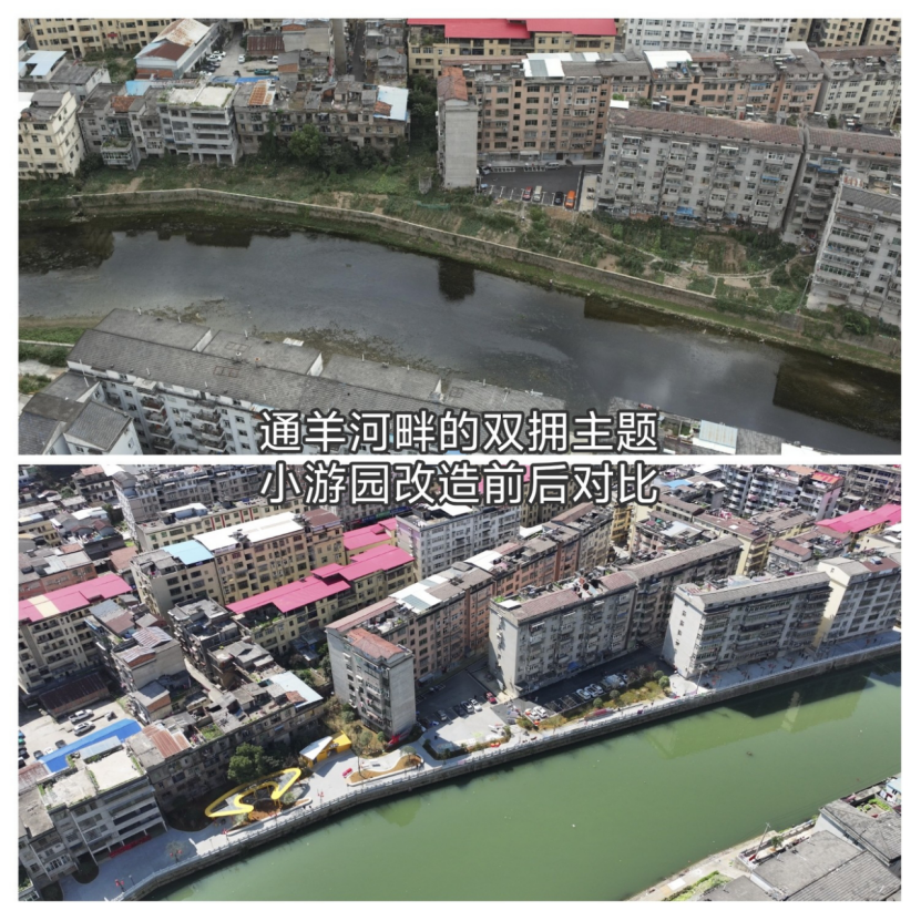 嵌在双泉社区里的双拥主题公园,以前就是通羊河畔一块没法落脚的荒地,既没有实际功能,还影响了河道两岸的景观,现在改造成10余亩的沿河小游园,不仅架起了通山老大桥到南门桥的慢行步道,还建了文化景观、公益服务点和停车场,周边小区的居民都爱来这晨练、散步、聊天。在这里和朋友下棋的程爹爹笑着说:“现在这里有健身器材还有休闲座椅,看着舒心,待着更舒心。”