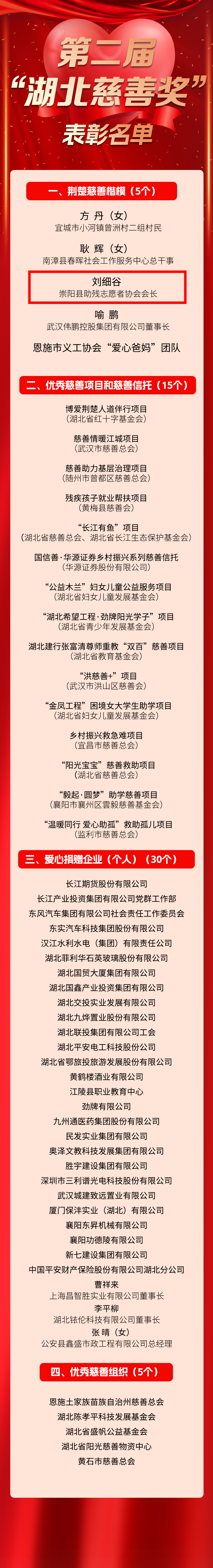 全国“四个100”最美志愿者、中国当代公益先锋人物、全省劳动模范……面对荣誉,刘细谷十分淡然:“这些不是终点,而是在时时刻刻提醒我不要忘记初心。”他用双脚丈量慈善之路,用大爱温暖荆楚大地,用实际行动诠释着“爱,才是人生最有力的双臂”。