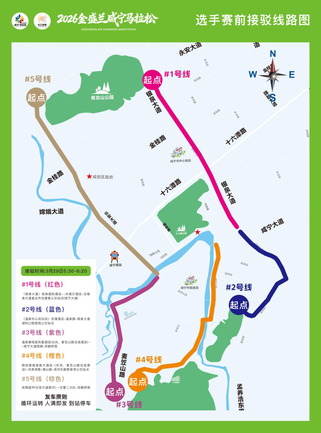 3月29日早上5:30-6:20分期间开通5条比赛专用公交线路(每班间隔15分钟),参赛选手在酒店门口路边和沿线公交站台候车,凭号码布免费乘车,具体线路如下: