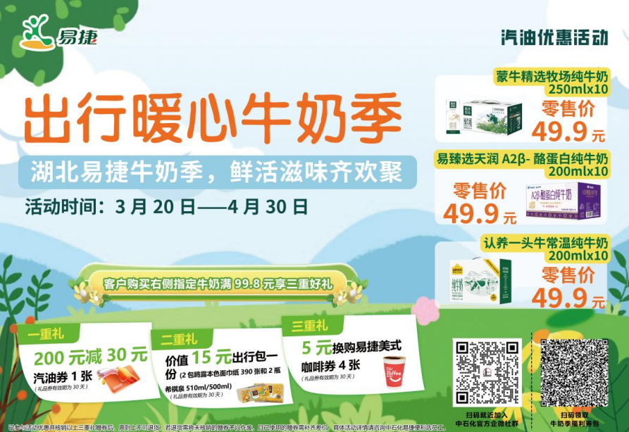 (云上咸宁编辑报道)草长莺飞,春和景明,正是踏春出行的好时节。中国石化易捷便利店开启春季专属促销活动,围绕出行、养车、生活等多重需求,推出专属套餐、牛奶专项特惠、百元专区、9.9元好物等超多福利,承包你的春日美好时光!