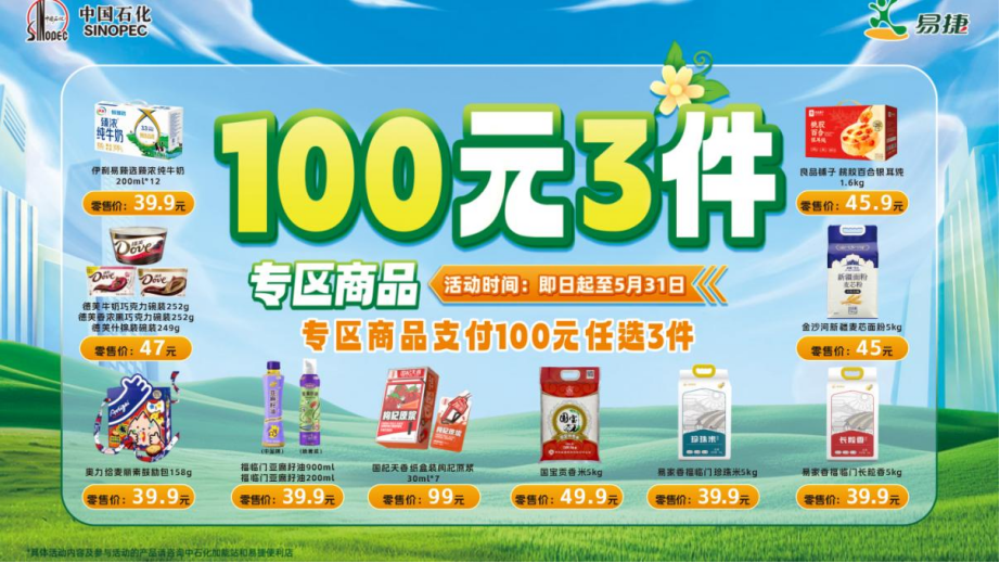 3月21日至5月31日,指定商品开展“百元三件”、“满百六折”专项优惠(活动优惠券通过易捷加油APP领券中心领取,每人每月可各领取8张)。20多款水饮料、粮油、食品等100元任选3件;140多款重点自有商品和大单品参与“满百六折”活动,更有170多款春日刚需好物,多款商品直降到底。