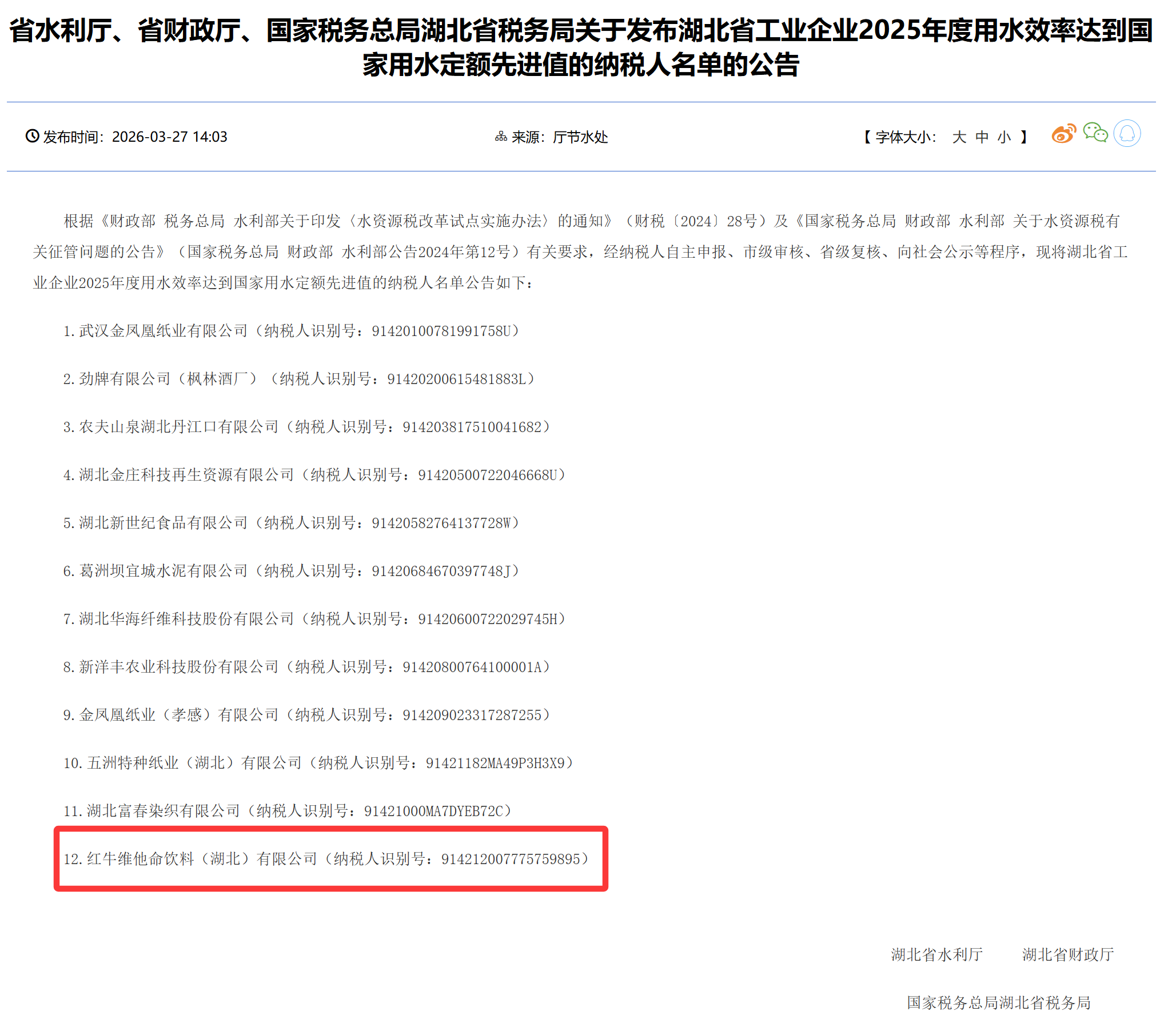 云上咸宁报道(记者 陈玲 通讯员 毛冬琴)近日,湖北省水利厅、省财政厅、国家税务总局湖北省税务局联合发布关于湖北省工业企业2025年度用水效率达到国家用水定额先进值的纳税人名单的公告,全省共有12家单位成功入选,咸宁市红牛维他命饮料(湖北)有限公司榜上有名,将享受今年20%的水资源税减免奖励。