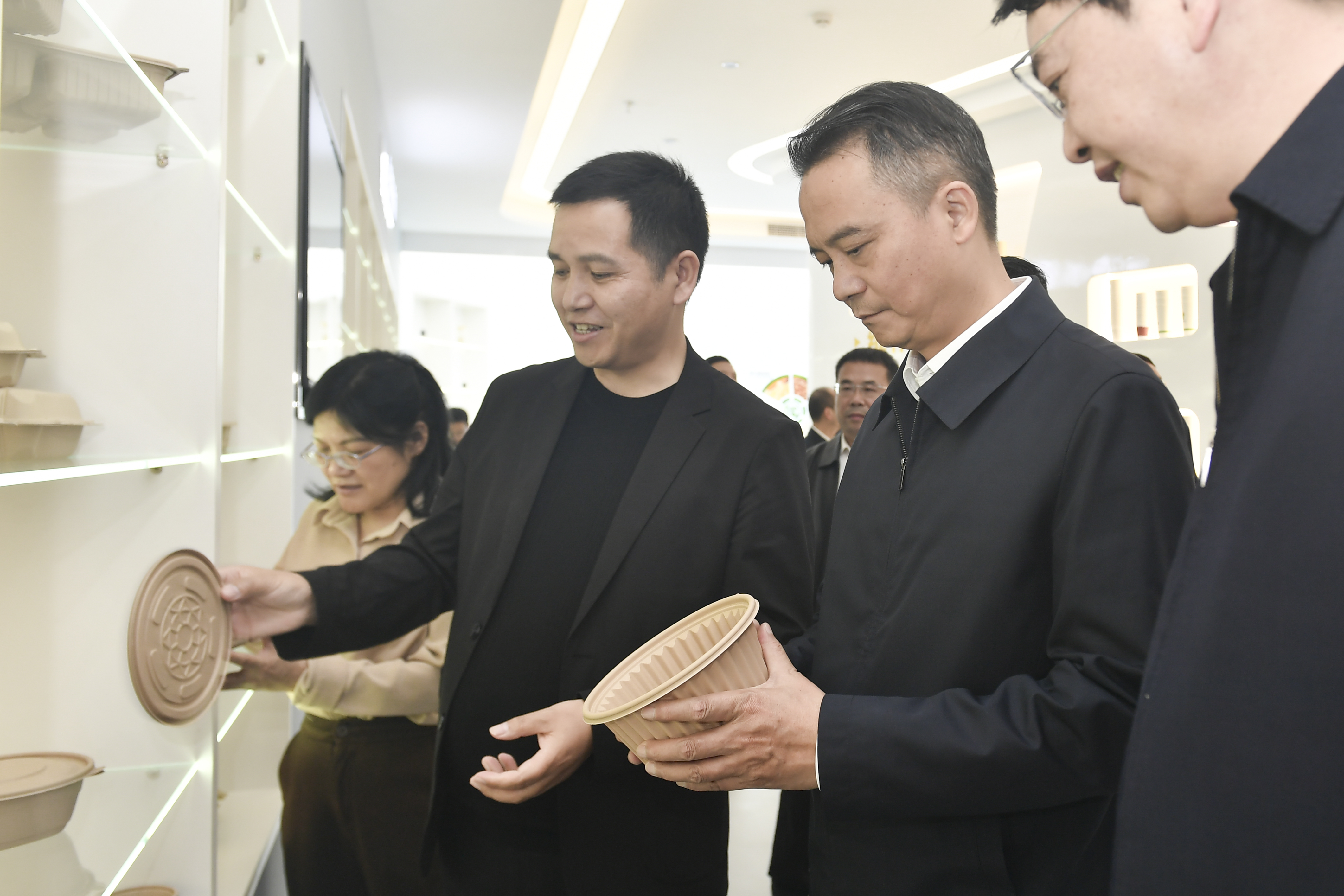 周锋走进企业产品展示大厅及生产车间,仔细了解企业生产工艺、主打产品及市场销售等情况,对企业发展理念及技术工艺表示肯定,希望企业秉承绿色发展初心,锚定生物基全降解及可降解原材料、环保包装容器等一次性环保型用品研发生产赛道,加强技术创新,不断丰富产品种类、拓展应用场景,更好满足现代社会对绿色、环保、健康生产生活方式的新要求新期待,为发展循环经济,走好绿色低碳发展之路作出新的更大贡献。