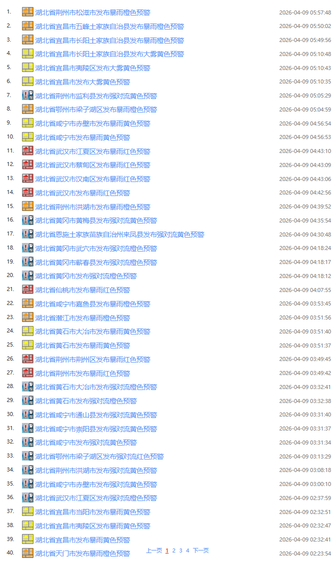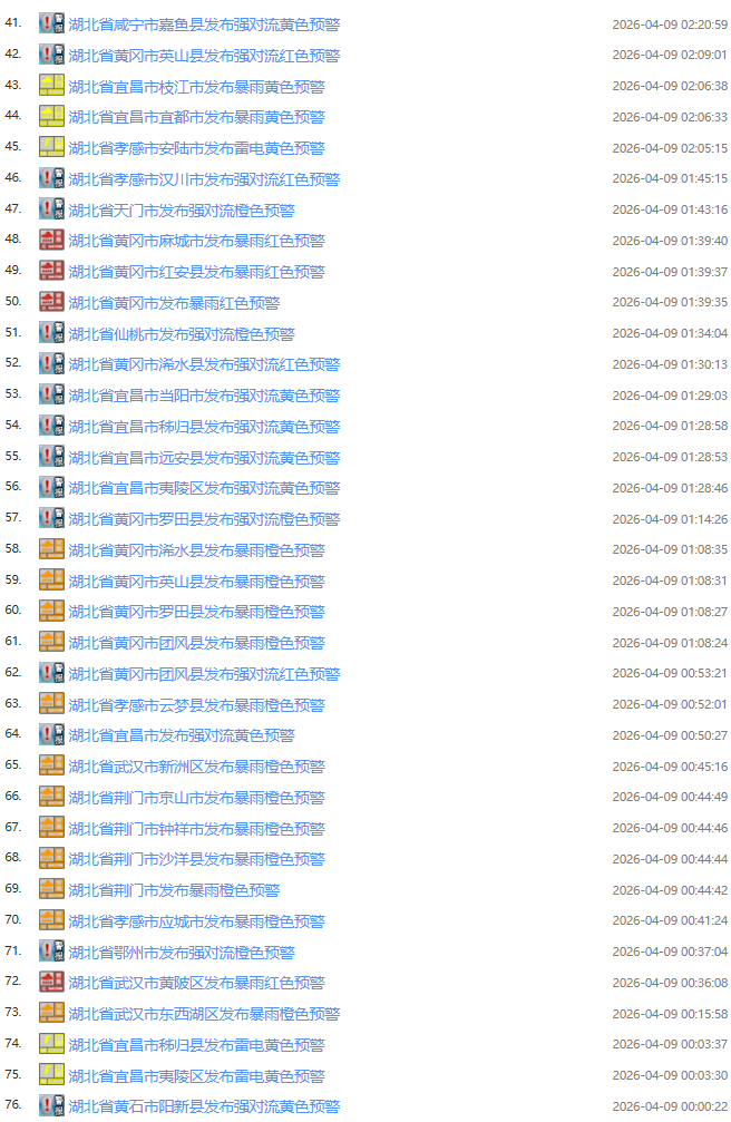 今日(4月9日)凌晨起,湖北武汉、仙桃、荆州、咸宁、天门、潜江等地发布暴雨预警,宜昌、黄冈、鄂州等地发布强对流预警。截至今日7点30分,湖北已经发布76条预警信息。